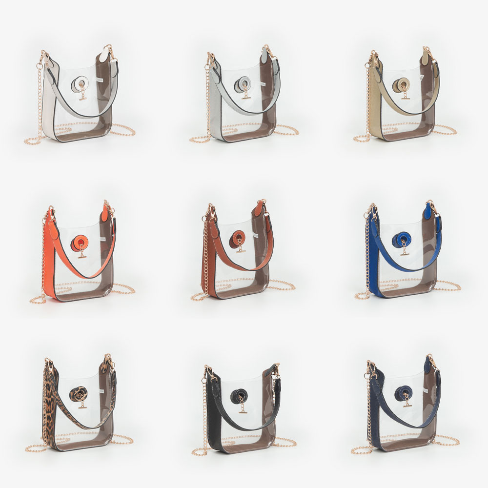 • This transparent chain shoulder bag blends modern minimalism with chic detailing. Featuring a clear structured body, secure clasp, and metallic chain strap, it’s perfect for concerts, events, or everyday outings, offering easy visibility and sleek sophistication in one stylish piece.