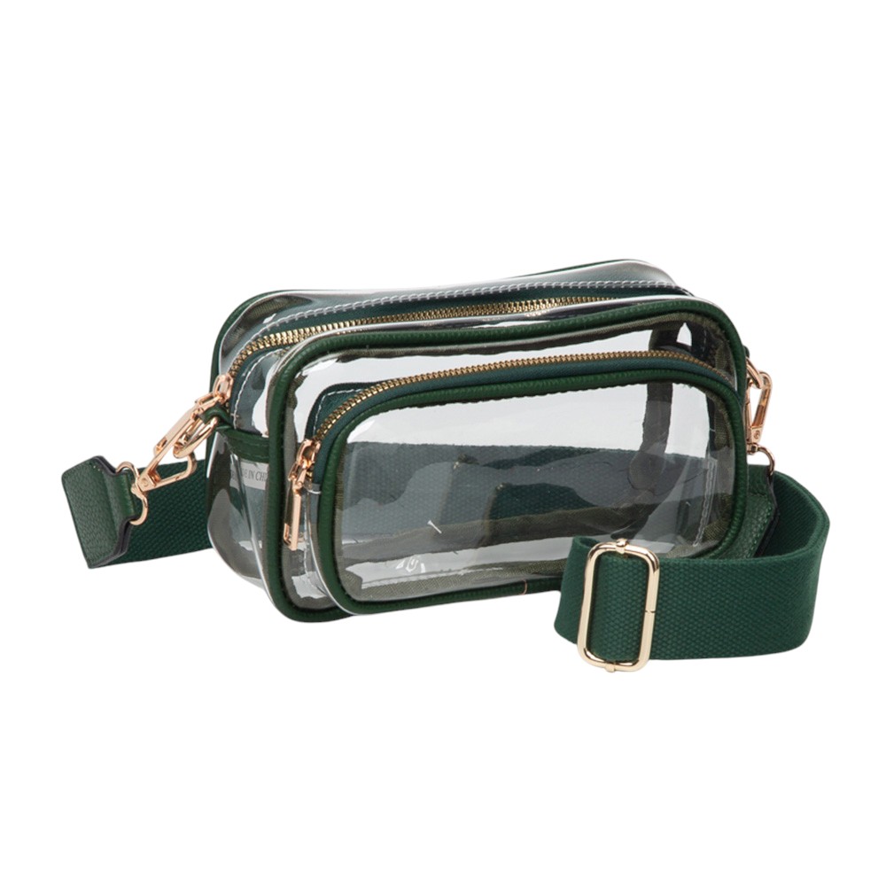 Details • Size : 8" X 5" X 3.5" • Strap Size : 53" L / Detachable, Adjustable • One Outside Zipper Pocket • Zipper Closure • Be game day ready with this clear stadium-approved crossbody bag, featuring white trim, dual zip compartments, and an adjustable strap for hands-free comfort. Perfect for concerts, sporting events, festivals, and venues with clear bag policies, offering style, security, and convenience on the go.