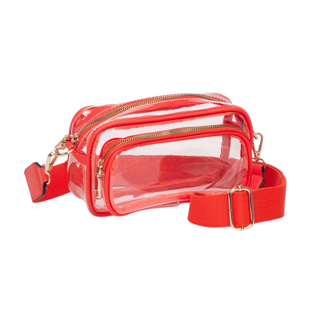 • Be game day ready with this clear stadium-approved crossbody bag, featuring white trim, dual zip compartments, and an adjustable strap for hands-free comfort. Perfect for concerts, sporting events, festivals, and venues with clear bag policies, offering style, security, and convenience on the go.