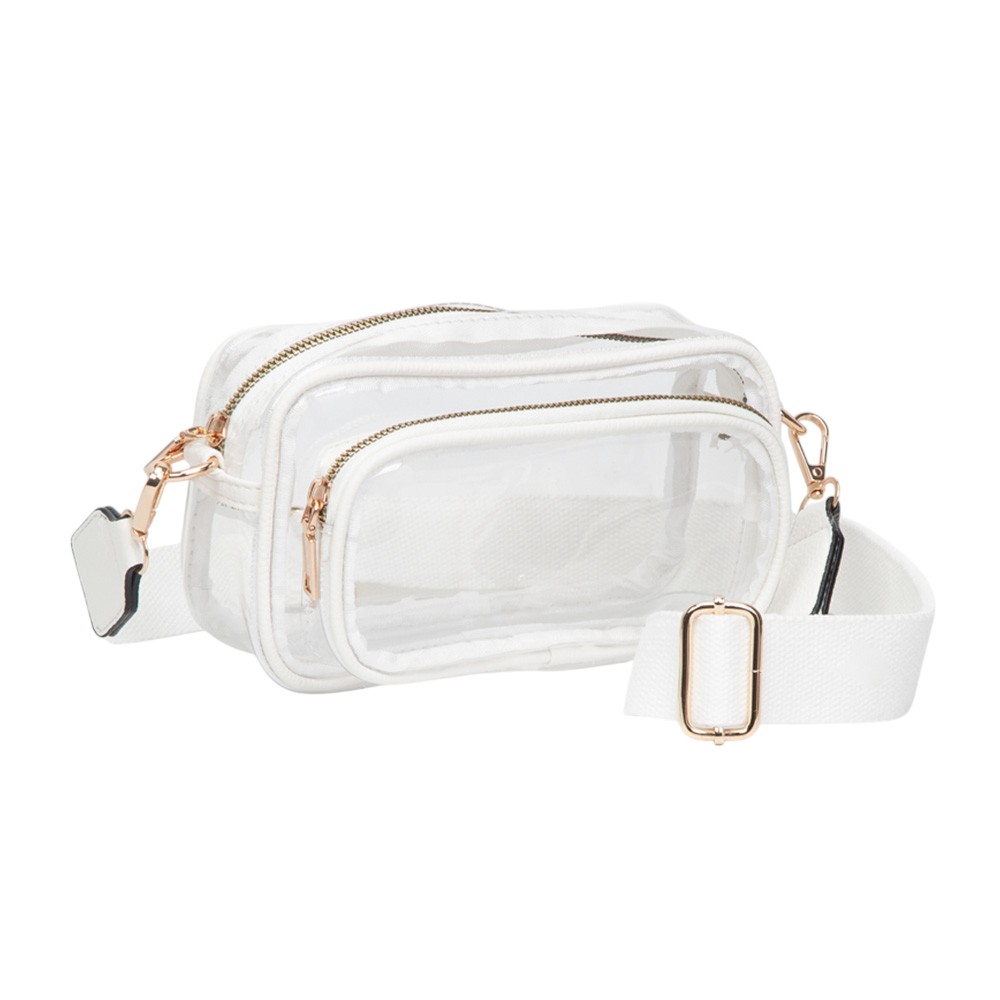 Details • Size : 8" X 5" X 3.5" • Strap Size : 53" L / Detachable, Adjustable • One Outside Zipper Pocket • Zipper Closure • Be game day ready with this clear stadium-approved crossbody bag, featuring white trim, dual zip compartments, and an adjustable strap for hands-free comfort. Perfect for concerts, sporting events, festivals, and venues with clear bag policies, offering style, security, and convenience on the go.