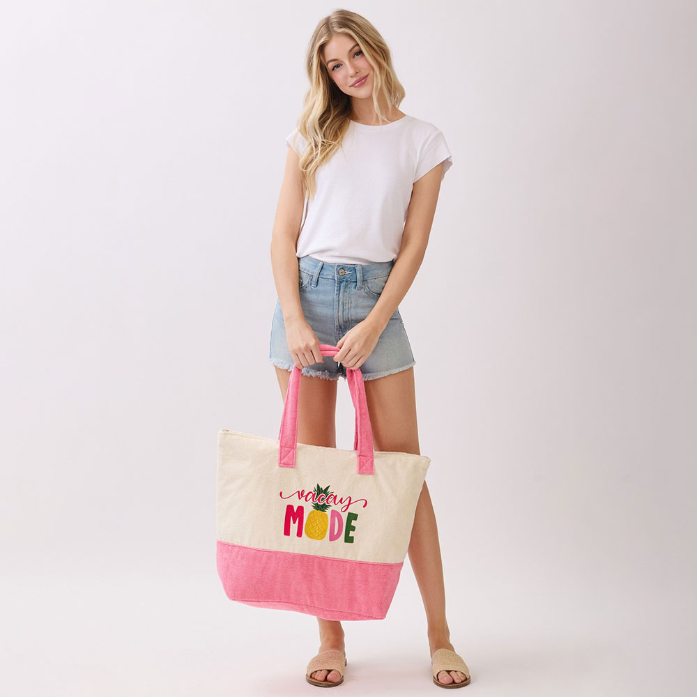 Details • Size : 22" X 16" X 6" • Inner Pocket • Zipper Closure • Material : 80% Polyester, 20% Polyamide • Spacious vacation themed tote bag featuring a playful “Vacation Mode” graphic design. Perfect for beach days, poolside lounging, shopping, or travel, this roomy carryall holds daily essentials with ease while adding a fun, relaxed statement to summer outfits and getaway looks.