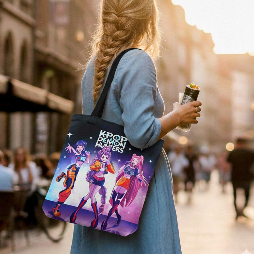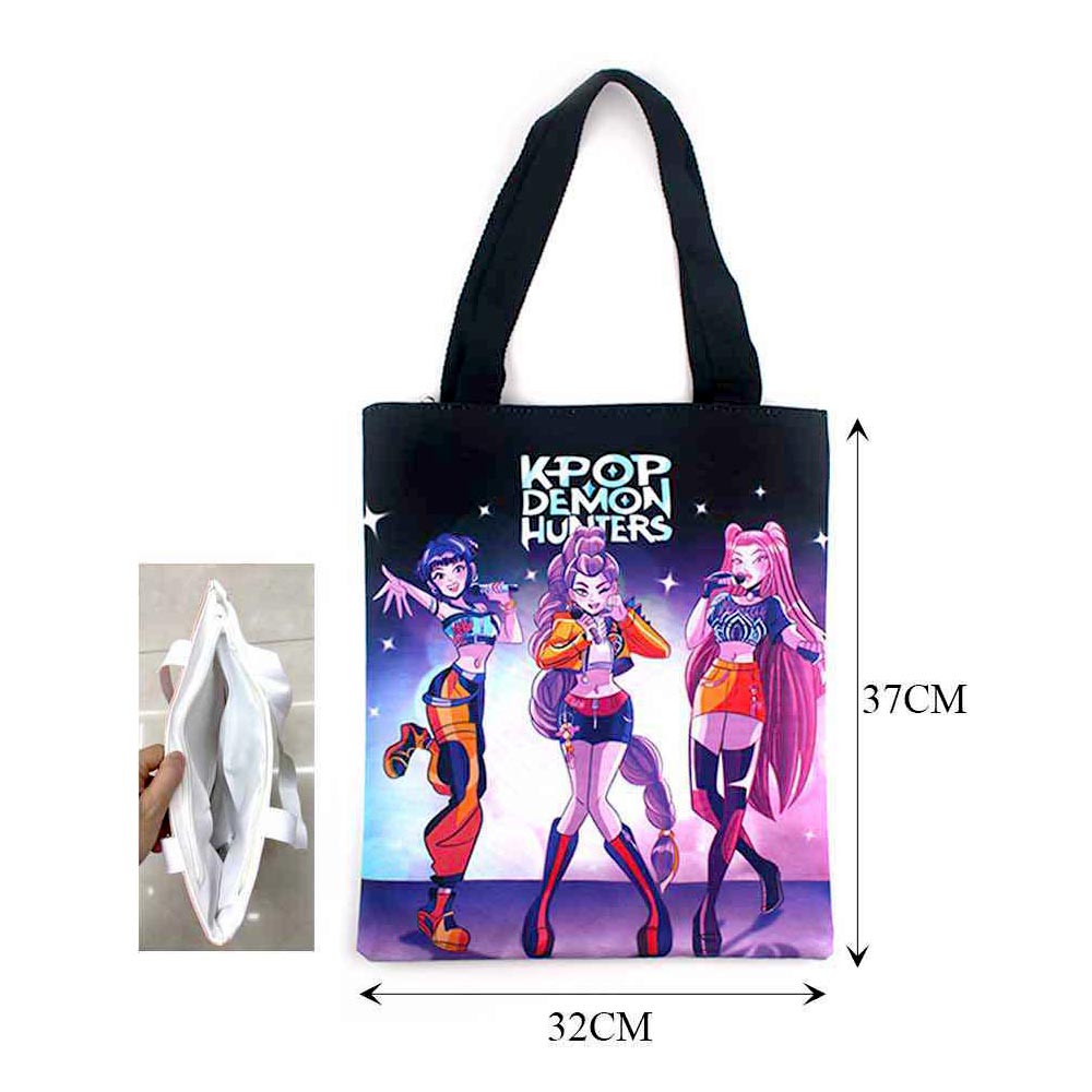 Details • Size : 12.6" X 14.5" • Top Handle Size : 10" L • Zipper Closure • Trendy character graphic tote bag inspired by K-Pop Demon Hunters, designed for fans of music, animation, and pop culture style. Ideal for shopping, school, travel, or daily errands, this reusable tote offers functional carry space while showcasing bold fan-favorite artwork.