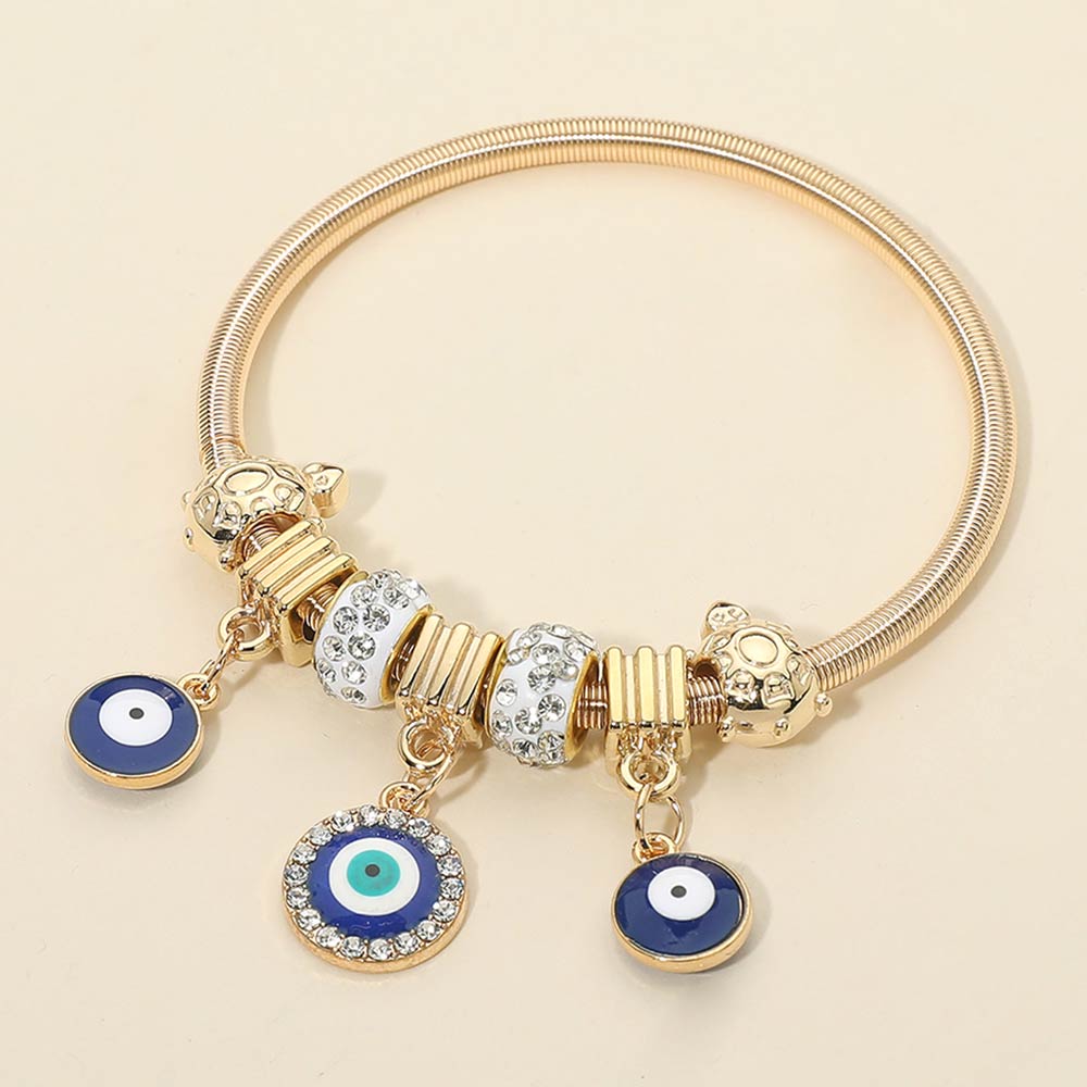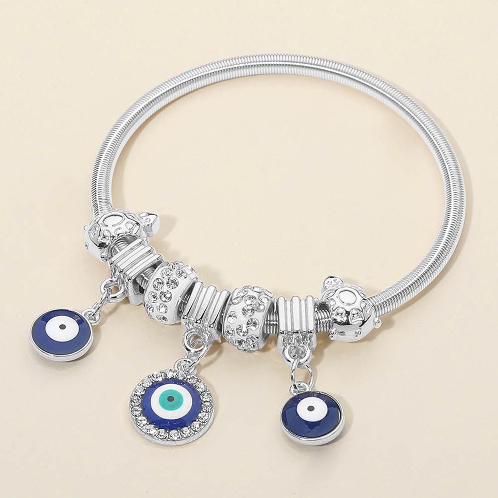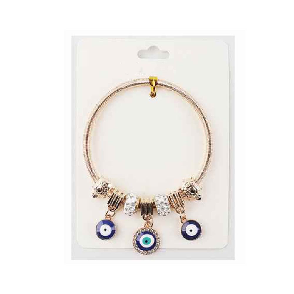 Details • Size : 0.2" H • Charm Size : 1.2" L • Stretchable • This evil eye charm bracelet features a flexible band design with layered bead accents and dangling evil eye symbols for eye-catching movement. A popular style for gift shops and trend-driven collections, it’s easy to stack, comfortable for daily wear, and ideal for everyday looks, seasonal assortments, and themed displays.