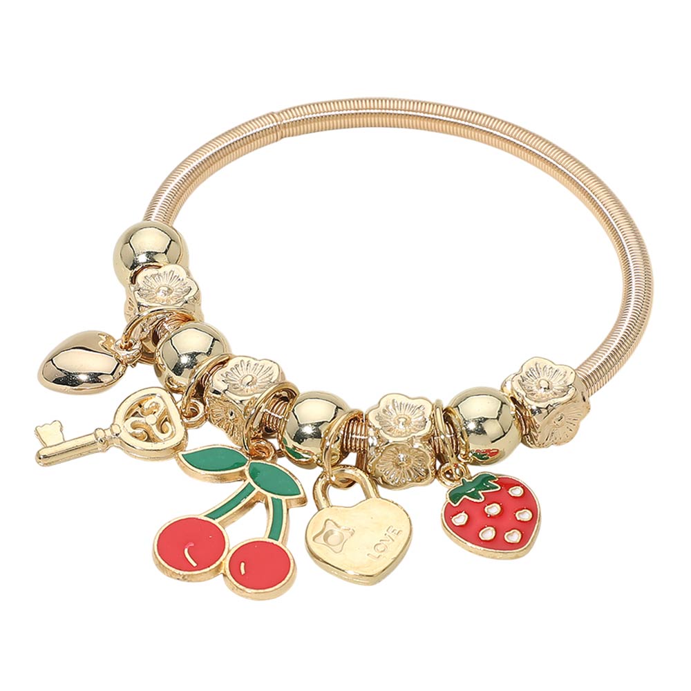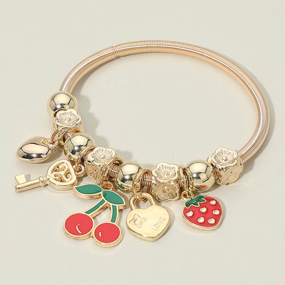 Details • Size : 0.3" H • Charm Size : 1" L • Stretchable • This fruit charm adjustable bracelet features a flexible band with playful dangle charms inspired by sweet fruit and symbolic motifs. Designed for easy wear and everyday styling, it adds a fun accent to casual looks, gifting, and seasonal collections. A charming accessory for stacking or wearing solo, perfect for boutiques seeking novelty jewelry with broad appeal.