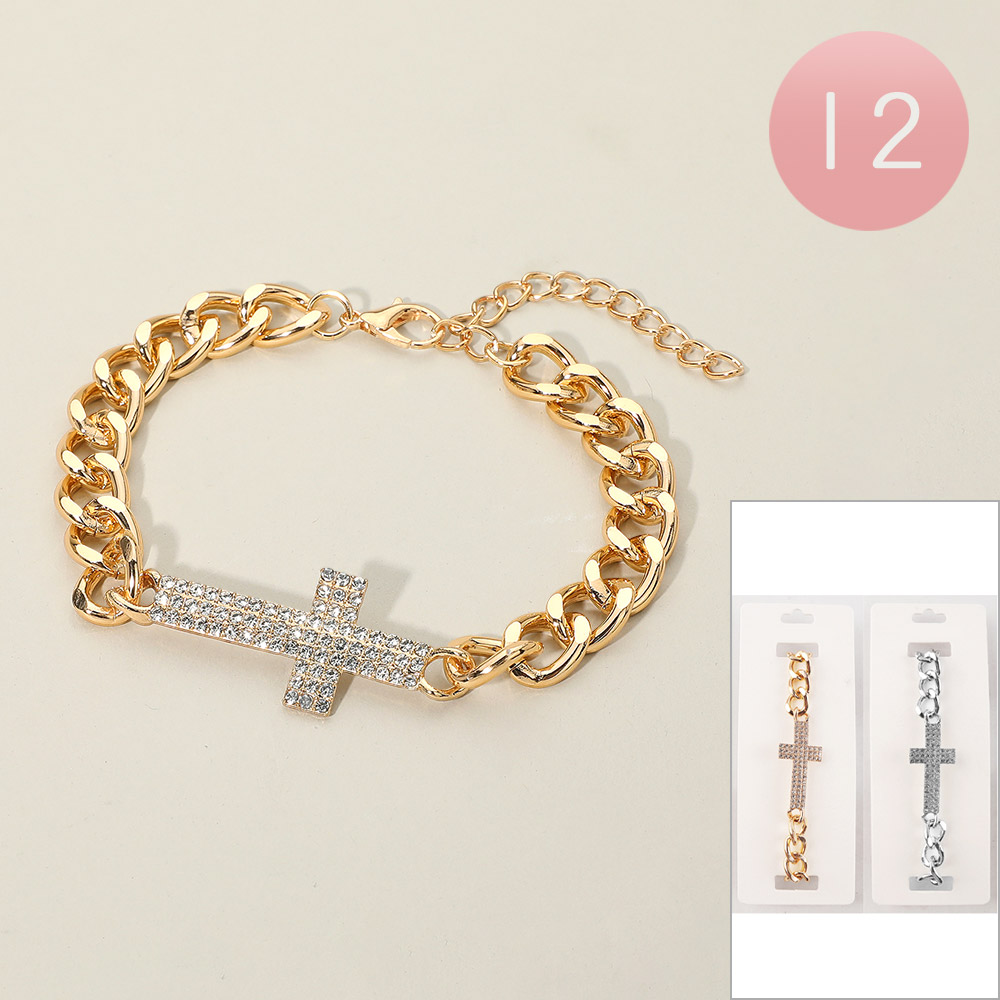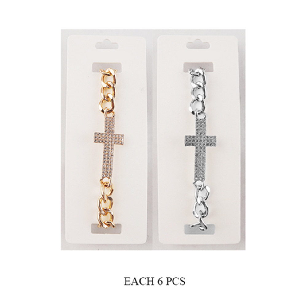 Details • Size : 0.8" H, 9.25" + 3" L • Lobster Clasp Closure • Add a refined touch to your look with this Cross Chain Bracelet, designed with a bold link chain and a sparkling rhinestone cross charm. Perfect for layering or wearing solo, this bracelet brings timeless elegance and modern sophistication to any outfit. • Lead and Nickel Compliant