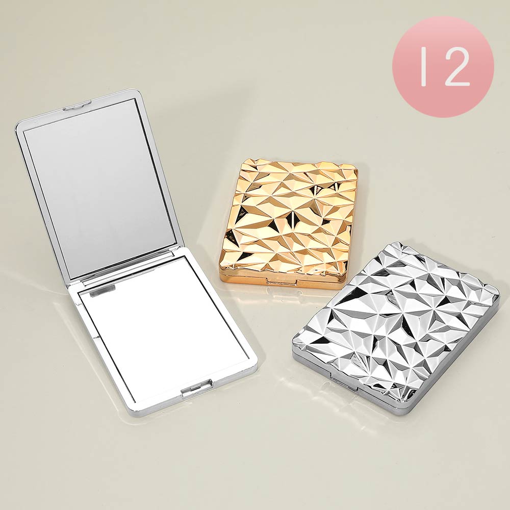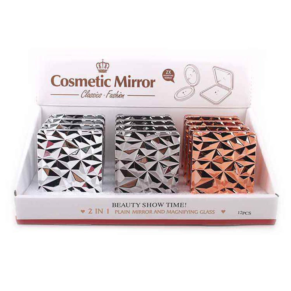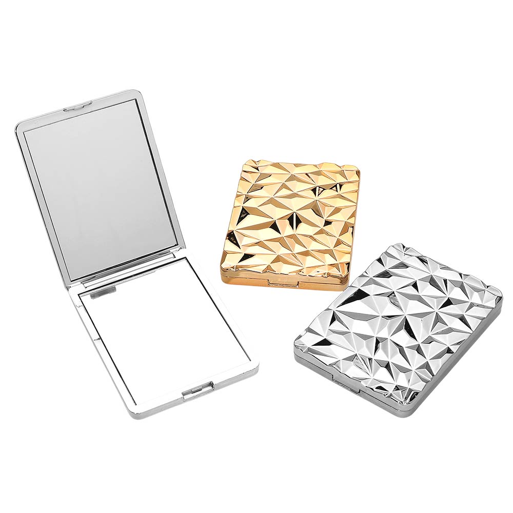 Details • Size : 2.4" X 3.3" • 2 In 1 - Plain Mirror And Magnifying Mirror • This geometric texture compact mirror features a sleek folding design with a clear reflective surface for quick beauty checks anytime. Slim and lightweight for easy storage in handbags or cosmetic pouches, it’s ideal for daily routines, travel, gifting, party favors, and boutique accessory collections.