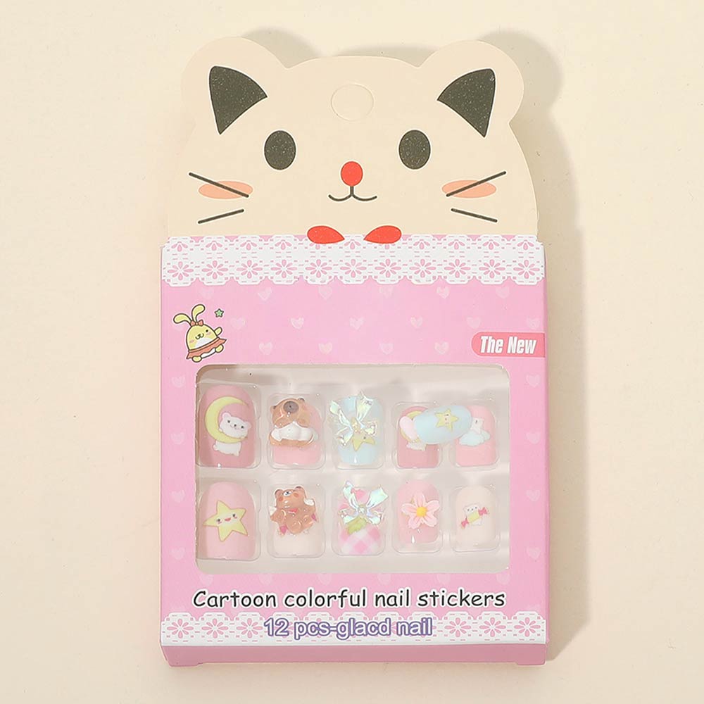 Details • Size : One Size • This kids cartoon press on nail set features 12 fun, pre-designed nail decals created for easy peel-and-stick use. Designed for little hands, it offers playful characters and cute accents that apply quickly without tools or drying time. Perfect for playdates, parties, gift sets, and kids beauty collections, these nail stickers encourage creativity, imagination, and mess-free self-expression.