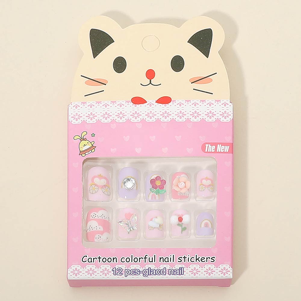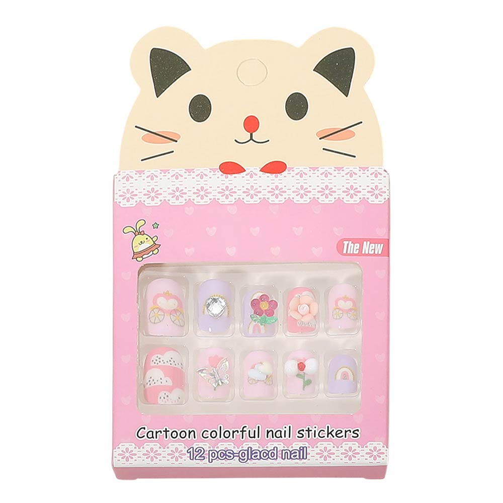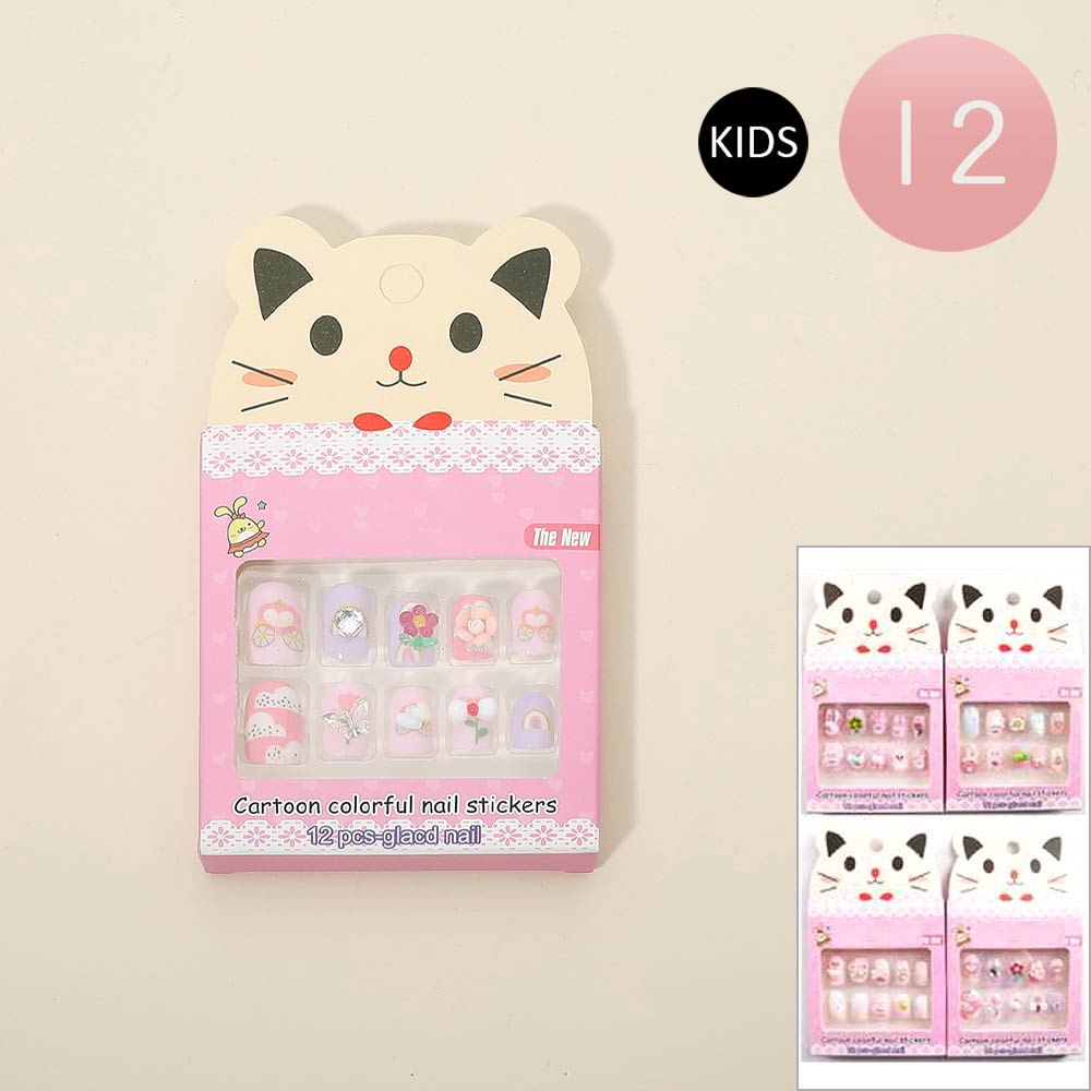 Details • Size : One Size • This kids cartoon press on nail set includes 12 fun, pre-designed nail decals made for easy peel-and-stick application. Created for small hands, these playful designs apply without tools or drying time, making them ideal for parties, playdates, gift sets, and kids beauty collections while encouraging creativity and mess-free self-expression.