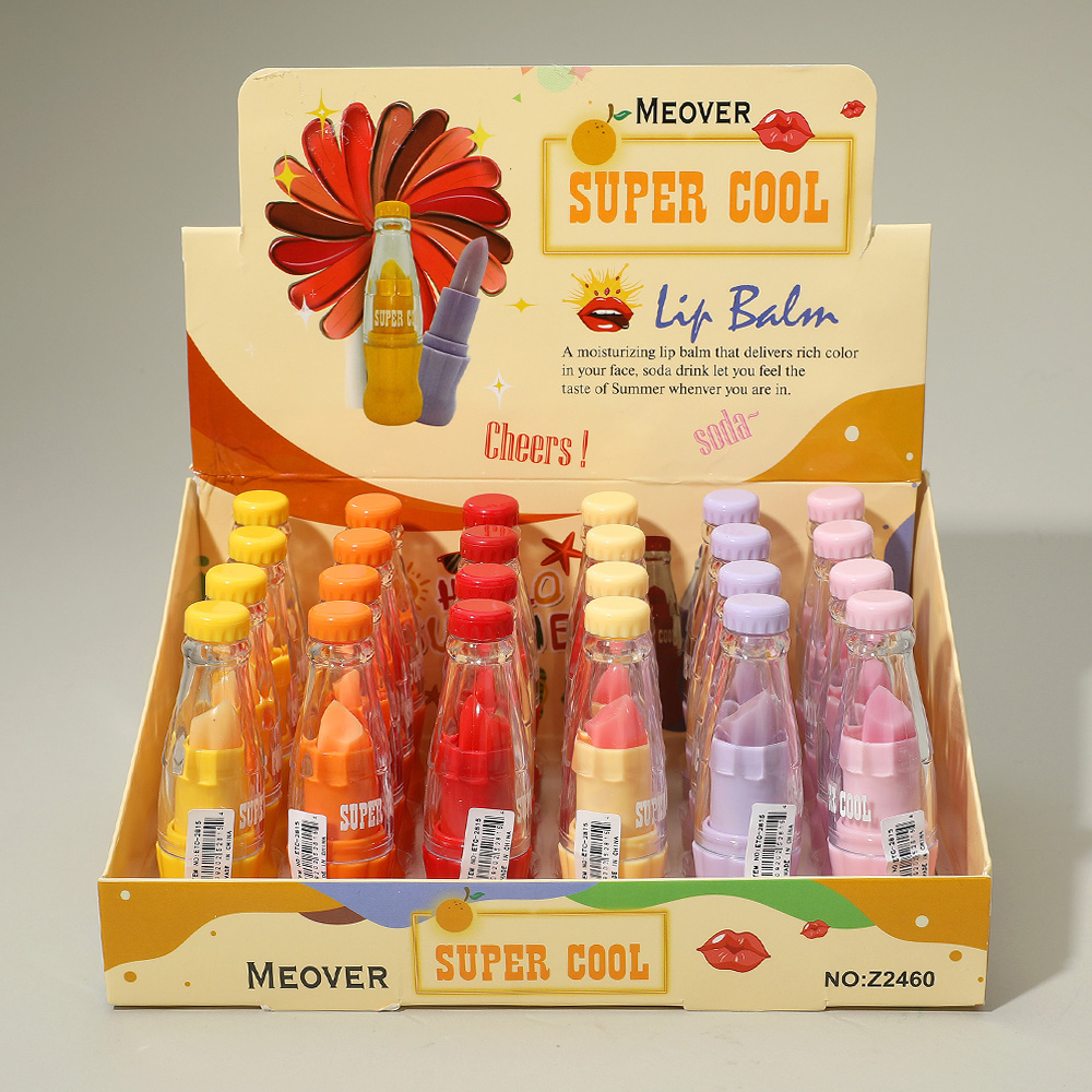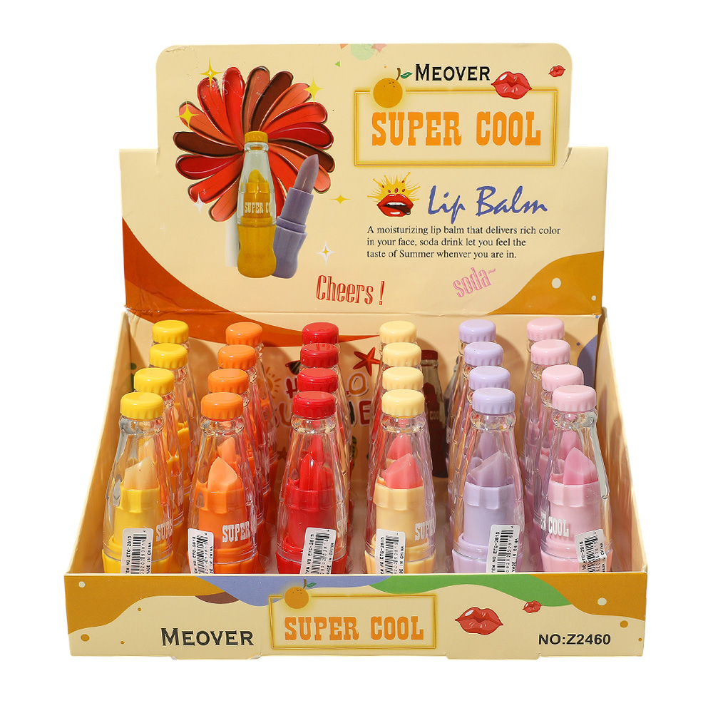 Details • Size : 1" X 3.25" • Keep your lips soft and hydrated with the Super Cool lip balm set in playful bottle-shaped packaging. Perfect for kids, teens, and beauty lovers, these balms add a touch of fun while providing daily nourishment and care for smooth, refreshed lips anytime.