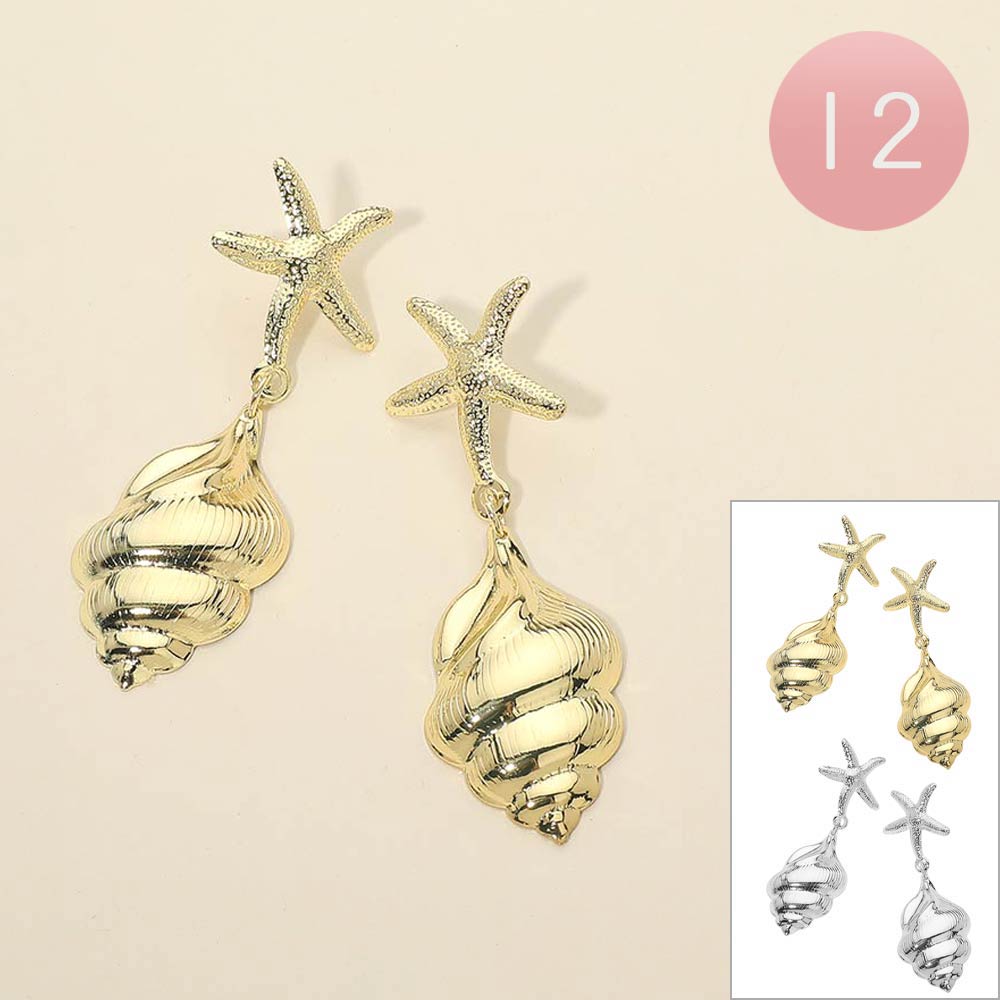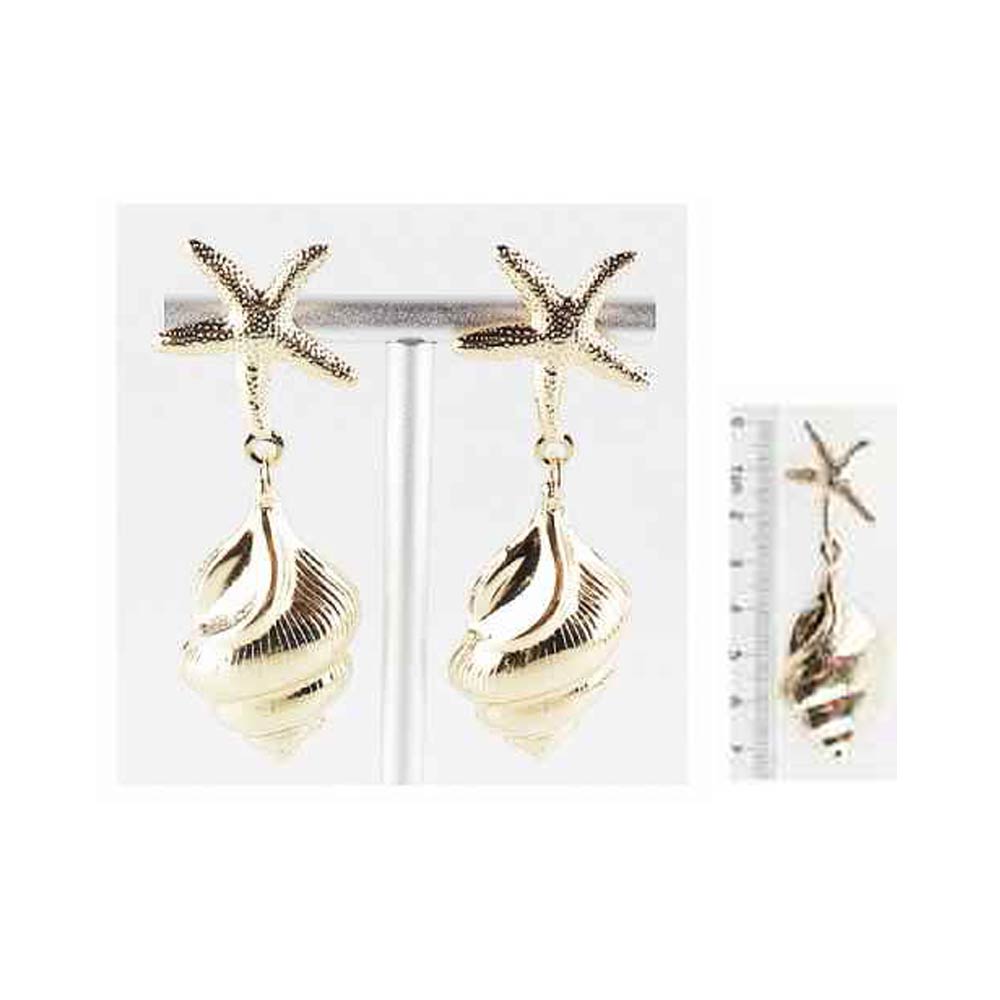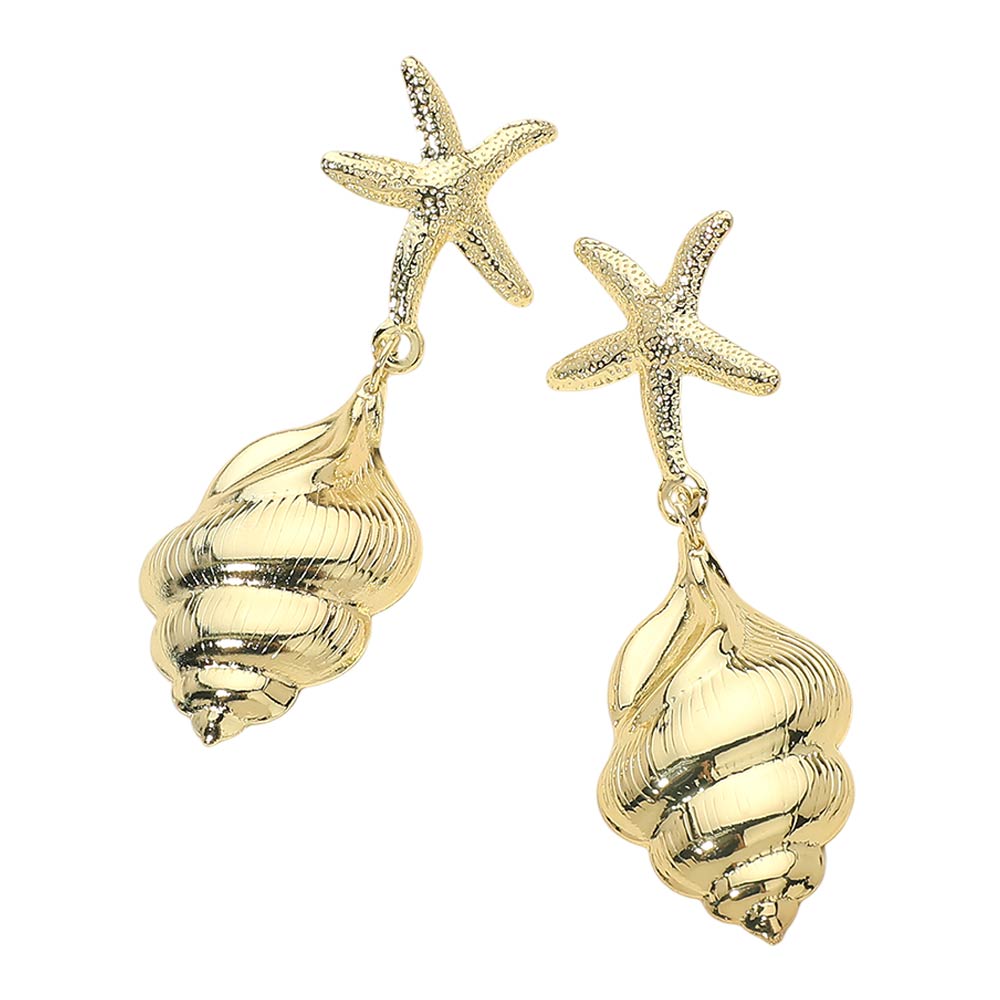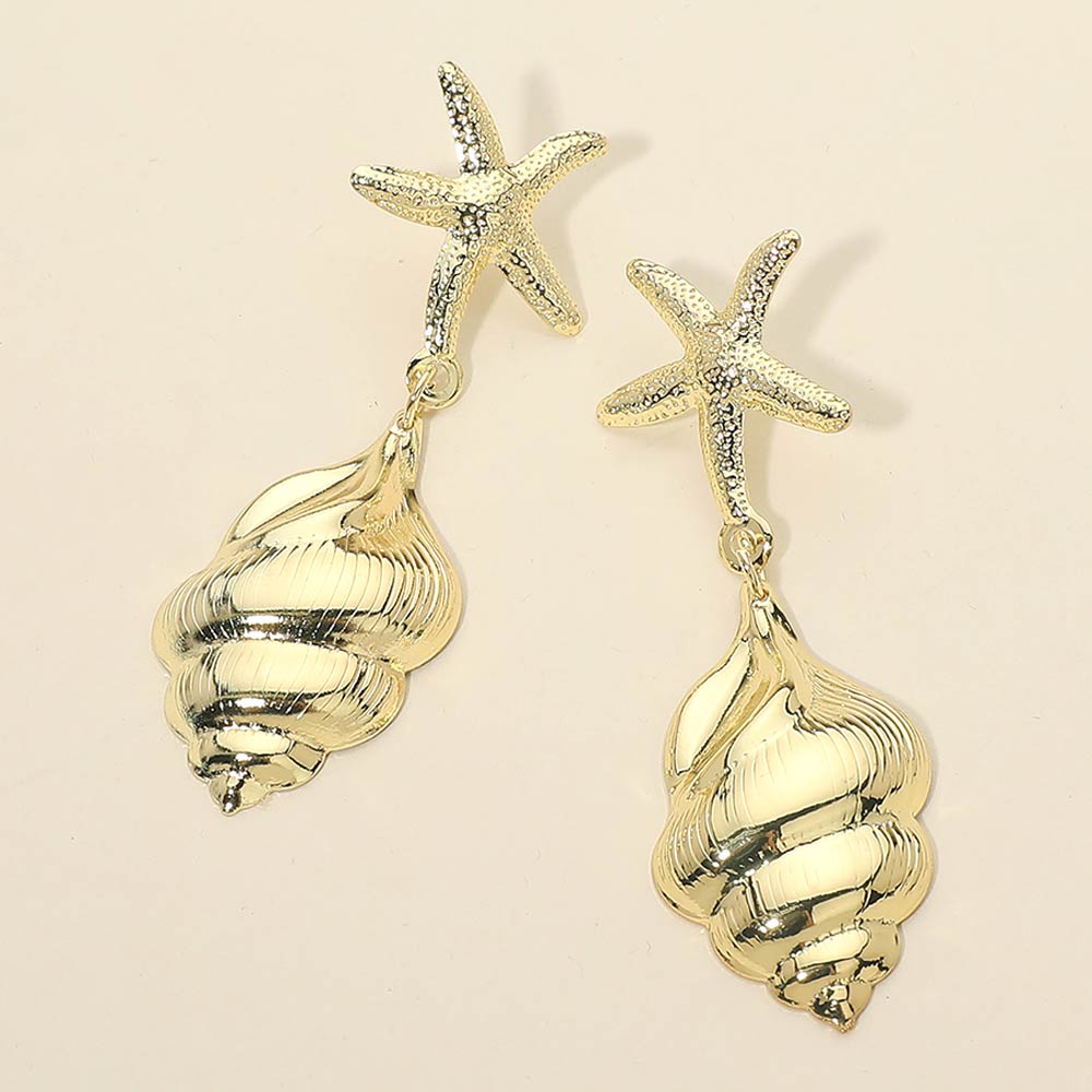 Details • Size : 1" X 2.9" • Post Back • These starfish and seashell drop earrings feature a playful coastal-inspired design with textured details and a graceful dangling silhouette. Perfect for summer styling, beach vacations, or resort looks, they add a bold yet elegant accent to casual and dressy outfits alike.
