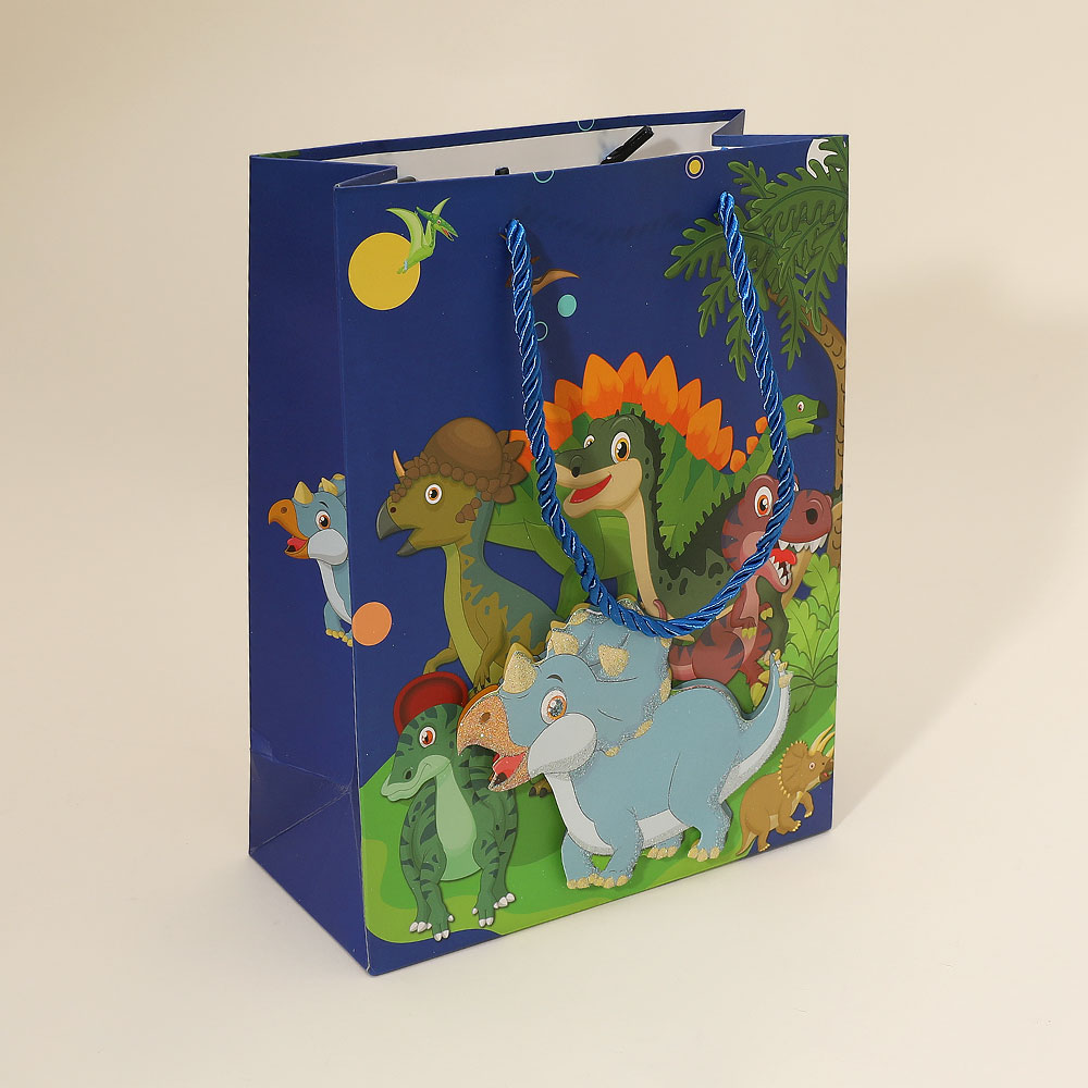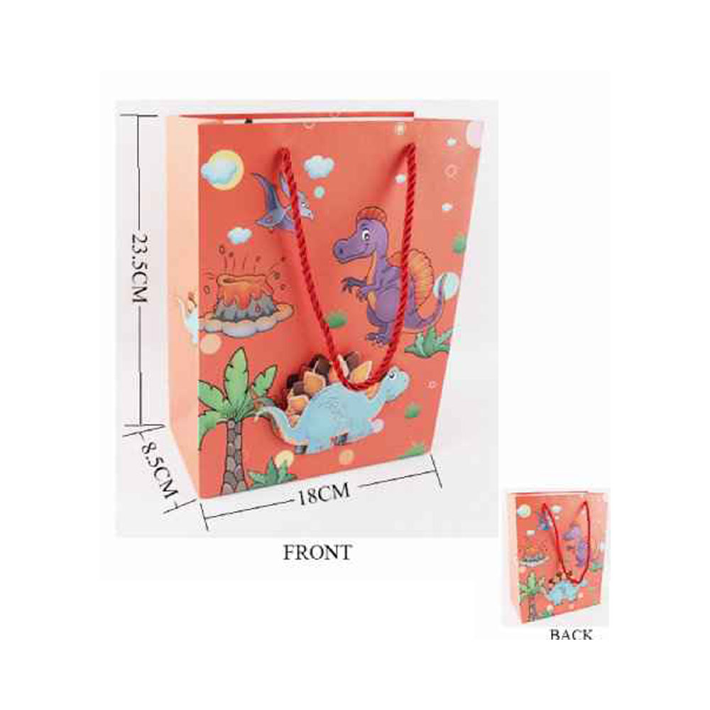 Details • Size : 7" X 9.25" X 3.35" • Top Handle Size : 4.75" L • Dinosaur Character Gift Bag features a fun illustrated scene with a spacious interior and sturdy carry handles, ideal for party favors, toys, snacks, or giveaways. Great for birthdays, school events, themed celebrations, and retail packaging with easy transport and reuse.