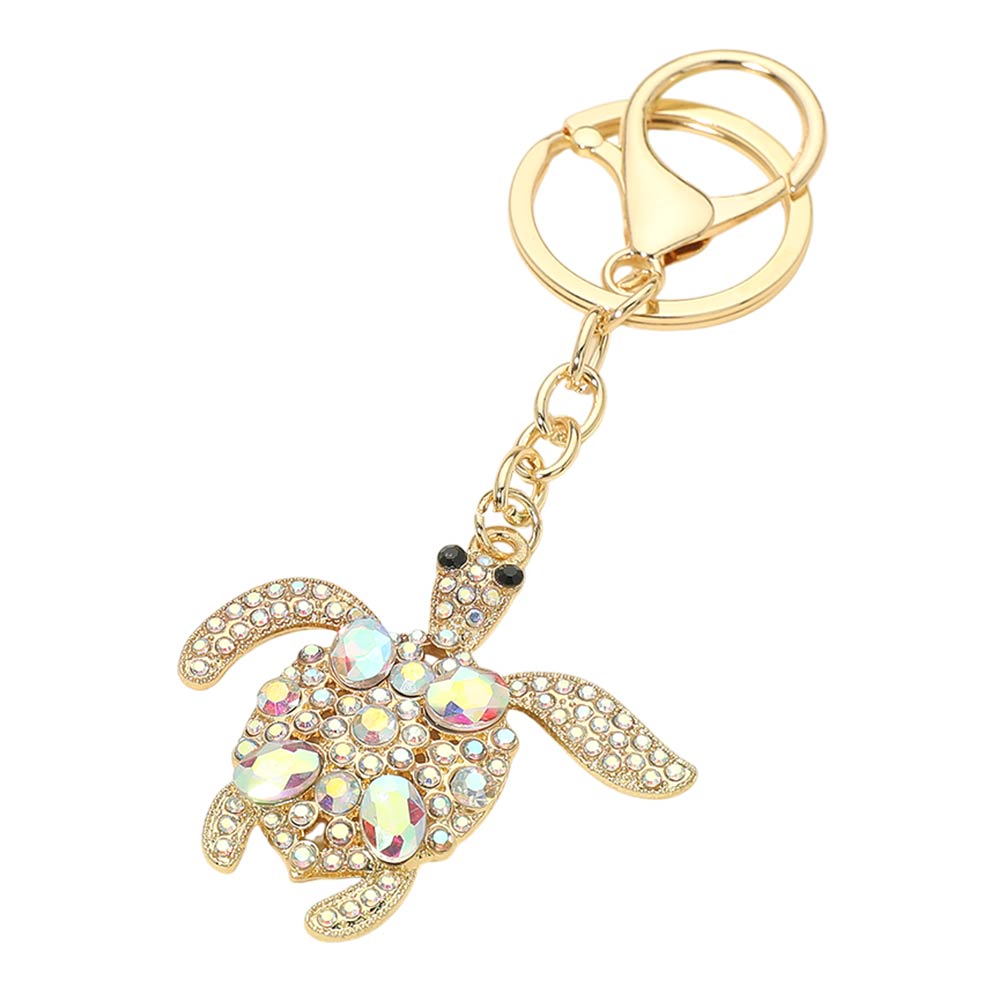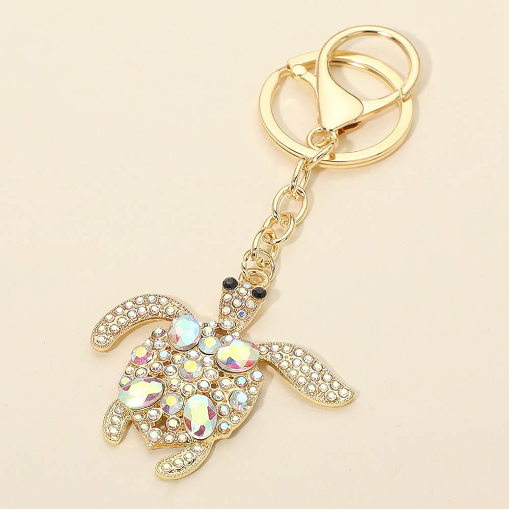 Details • Size : 4.25" L, 2" X 3.2" • Sparkling sea turtle charm keychain accented with crystal details and a playful silhouette. Designed with a sturdy keyring and lobster clasp for easy attachment to keys, bags, or backpacks. A charming accessory ideal for gifting, beach-themed displays, and everyday style.