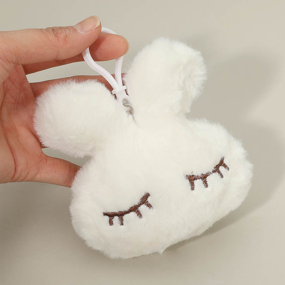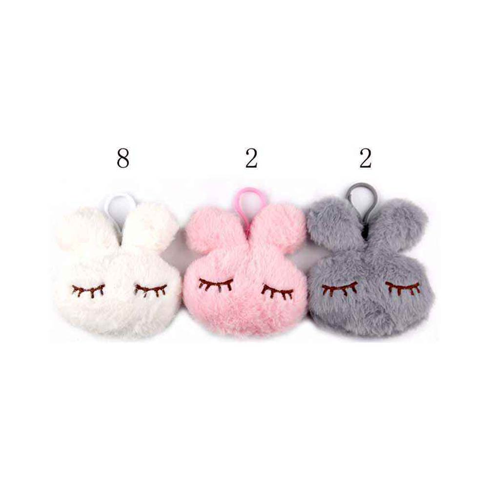 Details • Size : 4.6" L, 3.75" X 3.75" • Soft plush bunny face keychain featuring a playful sleepy expression and pom-style silhouette. Designed with a lightweight clip for easy attachment to bags, backpacks, or keys. A charming accessory choice for gift shops, party favors, seasonal displays, and cute character-themed collections.