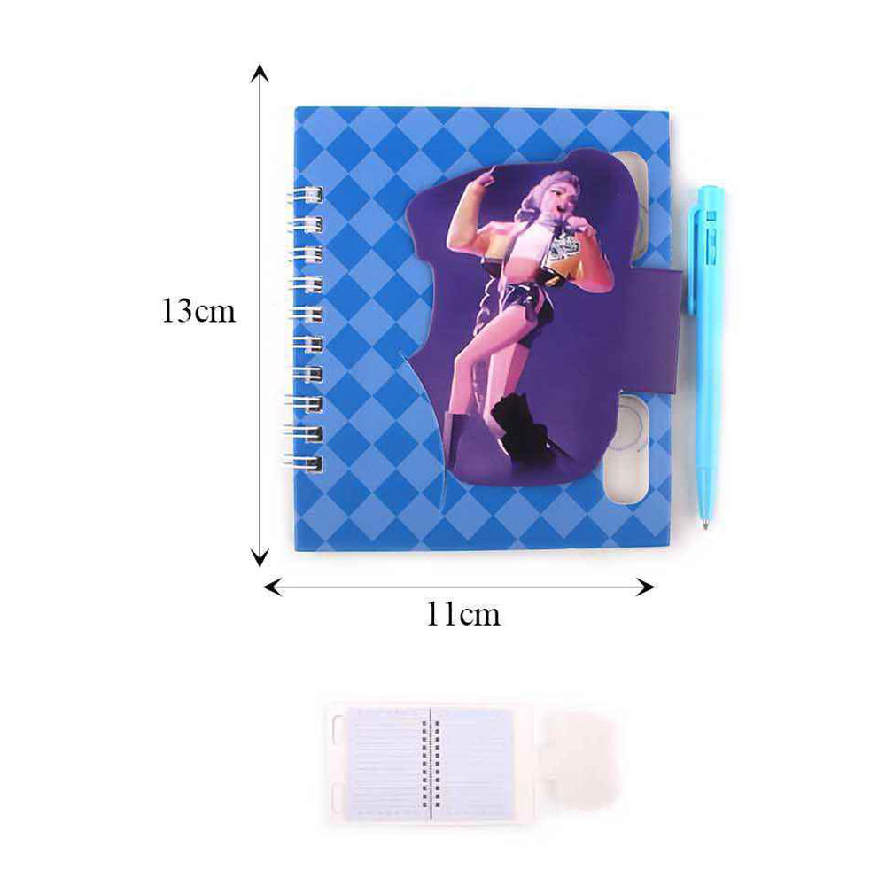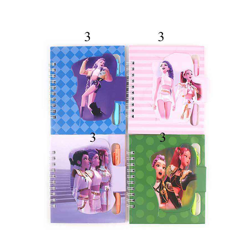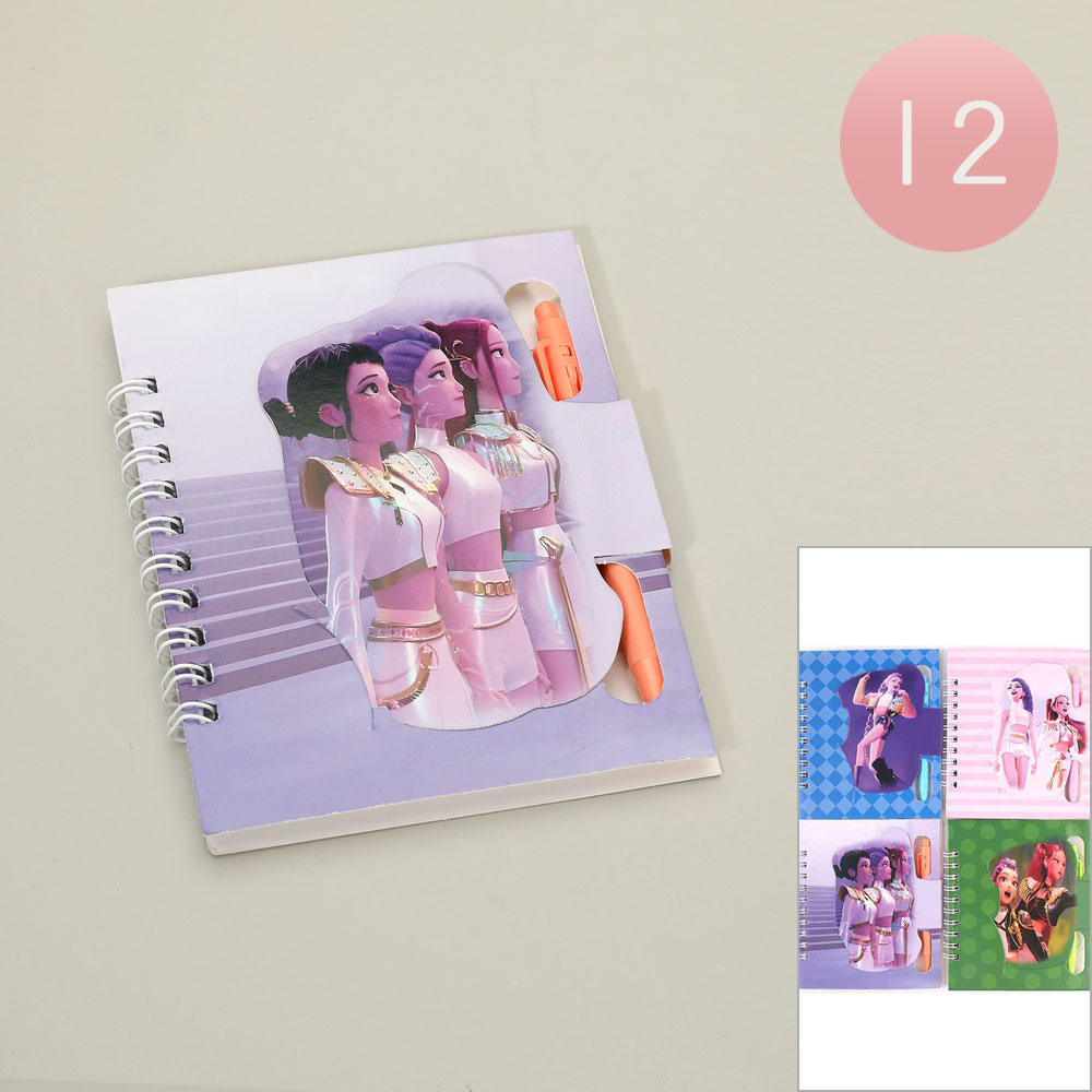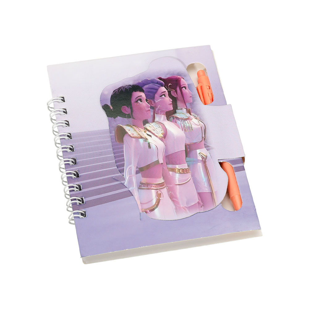 Details • Notebook Size : 4.25" X 5" • Ball Pen Size : 4" L • K-pop demon hunters spiral notebook featuring bold character artwork and a built-in pen holder. Designed for easy note-taking, journaling, and school use. A fun stationery item for fans, gift shops, and novelty collections that stands out on displays and encourages everyday creativity.
