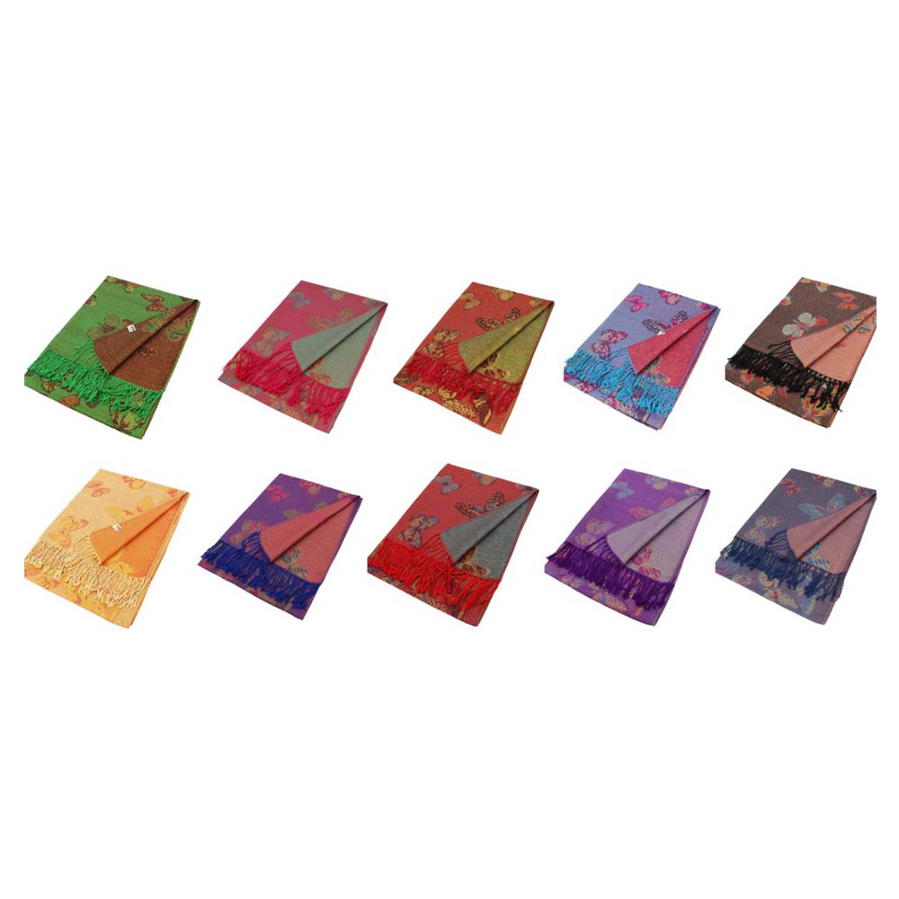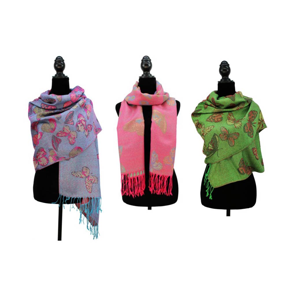 Details • Size : 27.5" X 76" • Fringe Size : 3.3" L • This butterfly pattern fashion wrap scarf features an elegant allover motif with soft fringe detailing for graceful drape and versatile styling. Ideal for layering with casual or dressy outfits, it works well for seasonal assortments, boutique collections, and gift-ready accessory displays.