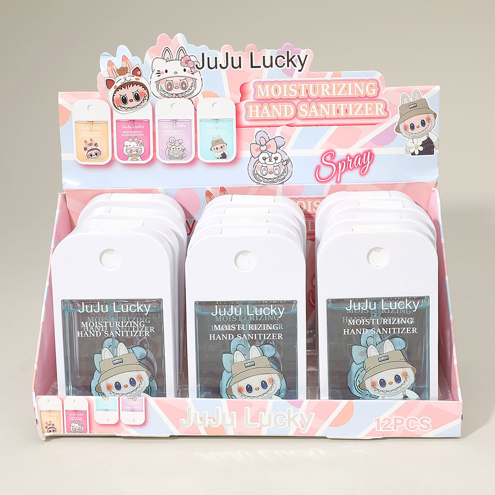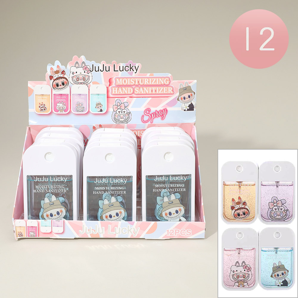 Details • Size : 2.25" X 4" (4.5ml) • Keep hands clean and soft with this 12-piece cartoon moisturizing hand sanitizer spray set. Featuring adorable character designs and compact bottles, each sanitizer offers refreshing protection on the go. Perfect for travel, school, or gifts while maintaining hygiene in style.