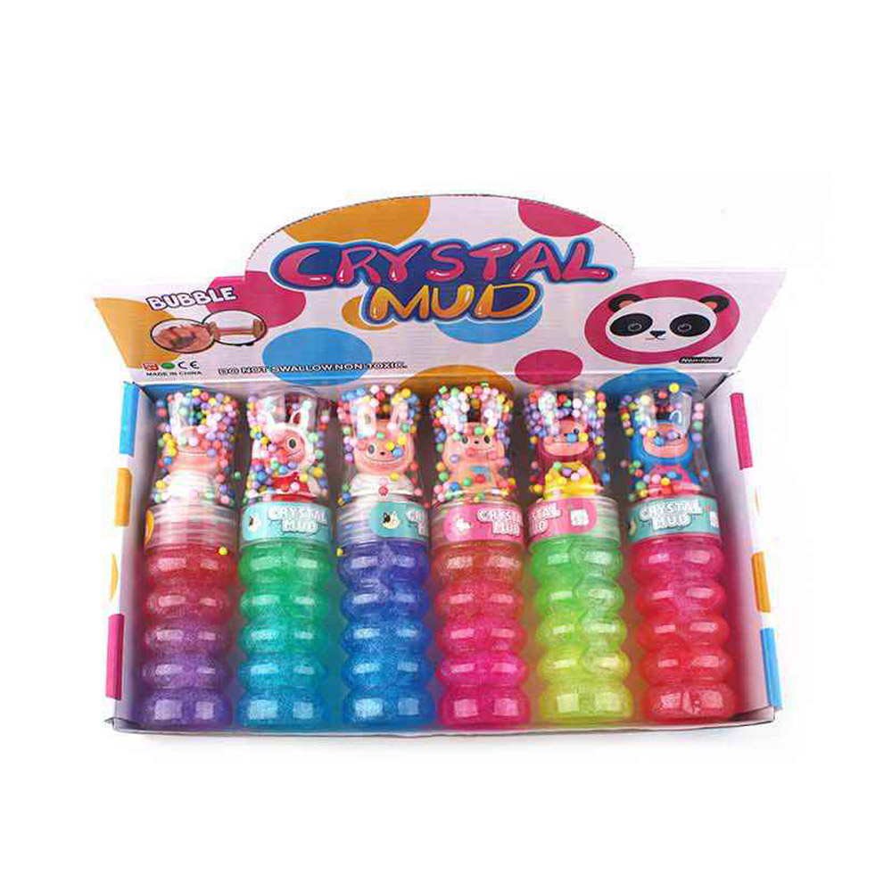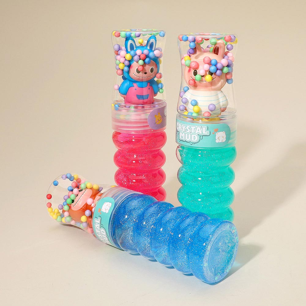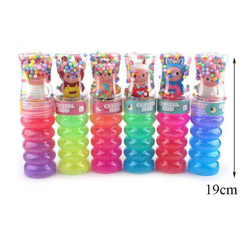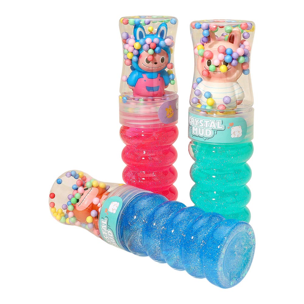 Details • Size : 7.5" L • Fun crystal mud toy set featuring glitter slime tubes topped with cute character figures. Includes assorted styles with textured containers and playful bead toppers. Great for sensory play, party favors, and imaginative activities.