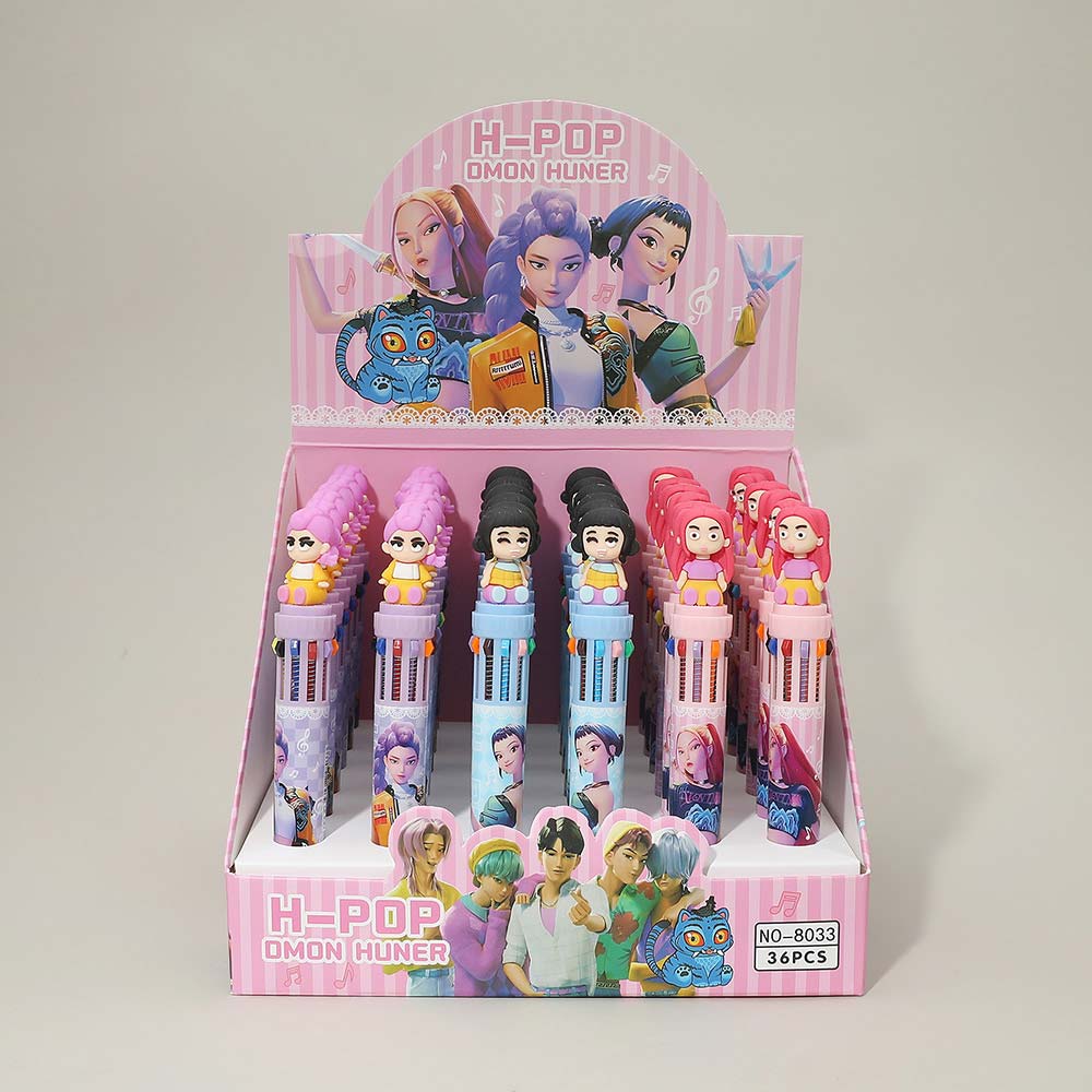 Details • Size : 6" L • This Kpop Demon Hunters character multi-ink pen display set includes collectible figure-top pens in assorted designs, ideal for stationery shops, gift stores, and pop culture displays. Designed for smooth writing and visual appeal, these novelty pens attract fans, students, and collectors while boosting impulse sales at checkout. Perfect for bulk retail, party favors, and themed merchandise collections.
