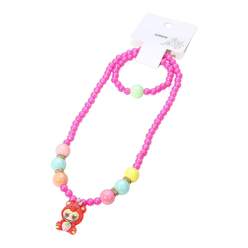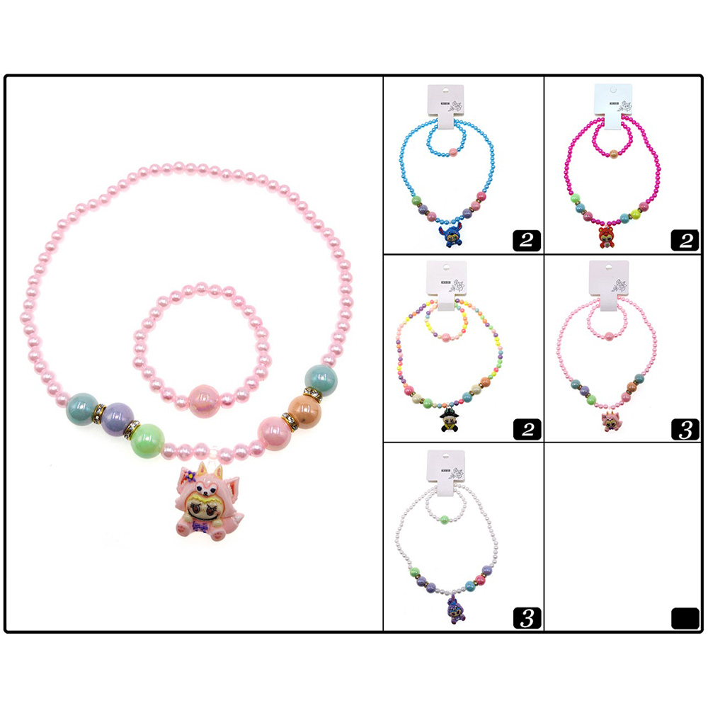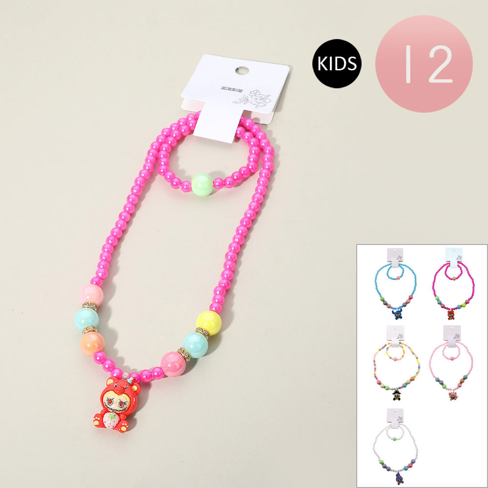 Details • Necklace Size : 15" L / Stretchable • Pendant Size : 1.3" L • Bracelet Size : 0.7" H / Stretchable • Charming kids’ necklace set featuring playful beads and a fun character charm. With stretch design for easy wear, this 12-piece pack makes perfect party favors, birthday gifts, or everyday accessories, adding a cheerful touch to children’s outfits and jewelry collections.