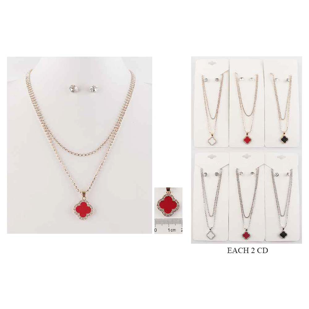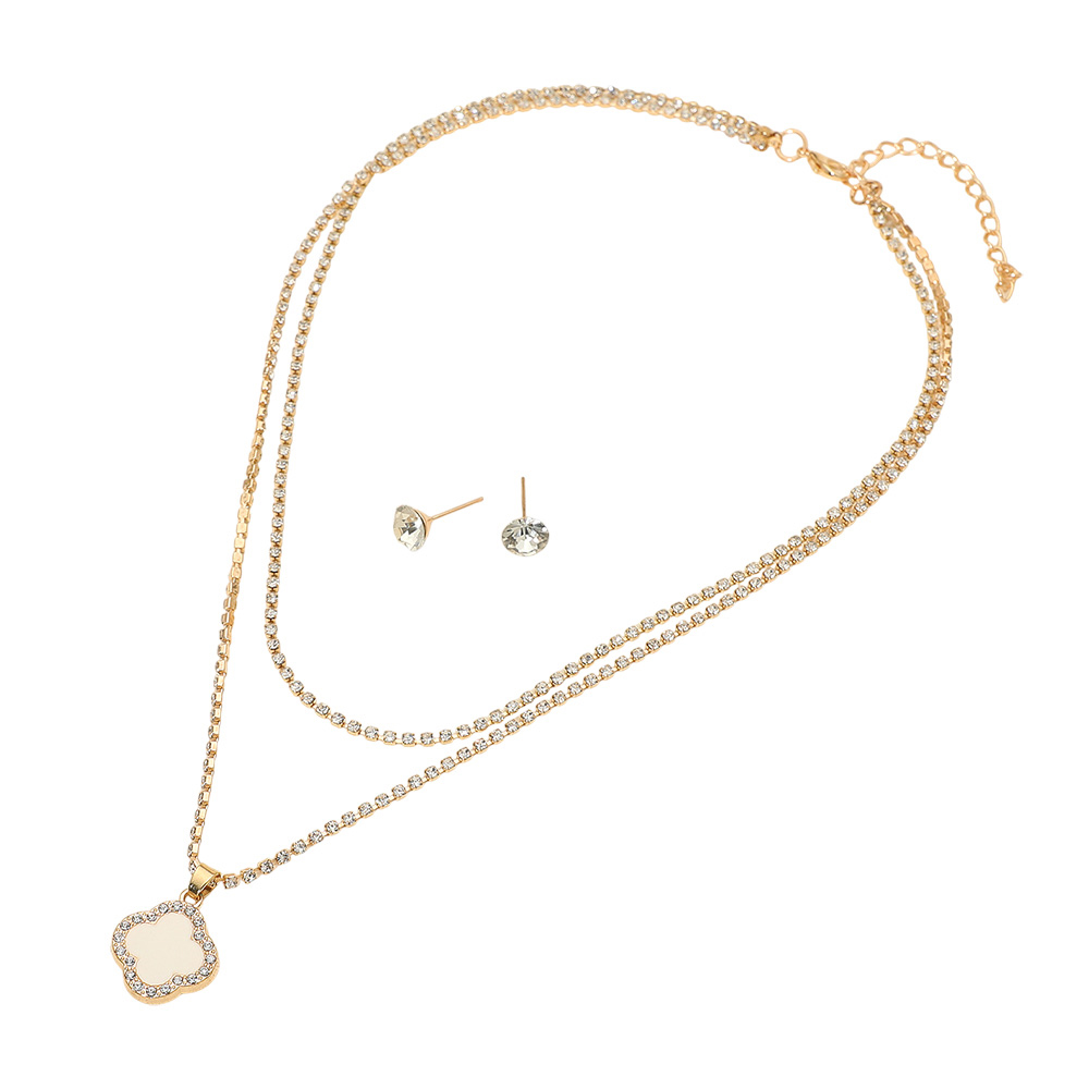 Details • Necklace Size : 16.5" + 2.5" L • Decor Size : 2.5" L • Pendant Size : 0.7" X 1" • Earrings Size : 0.3" L • Complete your look with this quatrefoil pendant tennis necklace and stud earring set featuring a continuous sparkling chain and a delicate quatrefoil-shaped charm centerpiece. Designed for coordinated wear or styling separately, it adds refined elegance to everyday outfits and special occasions, making it a versatile, gift-ready accessory set.