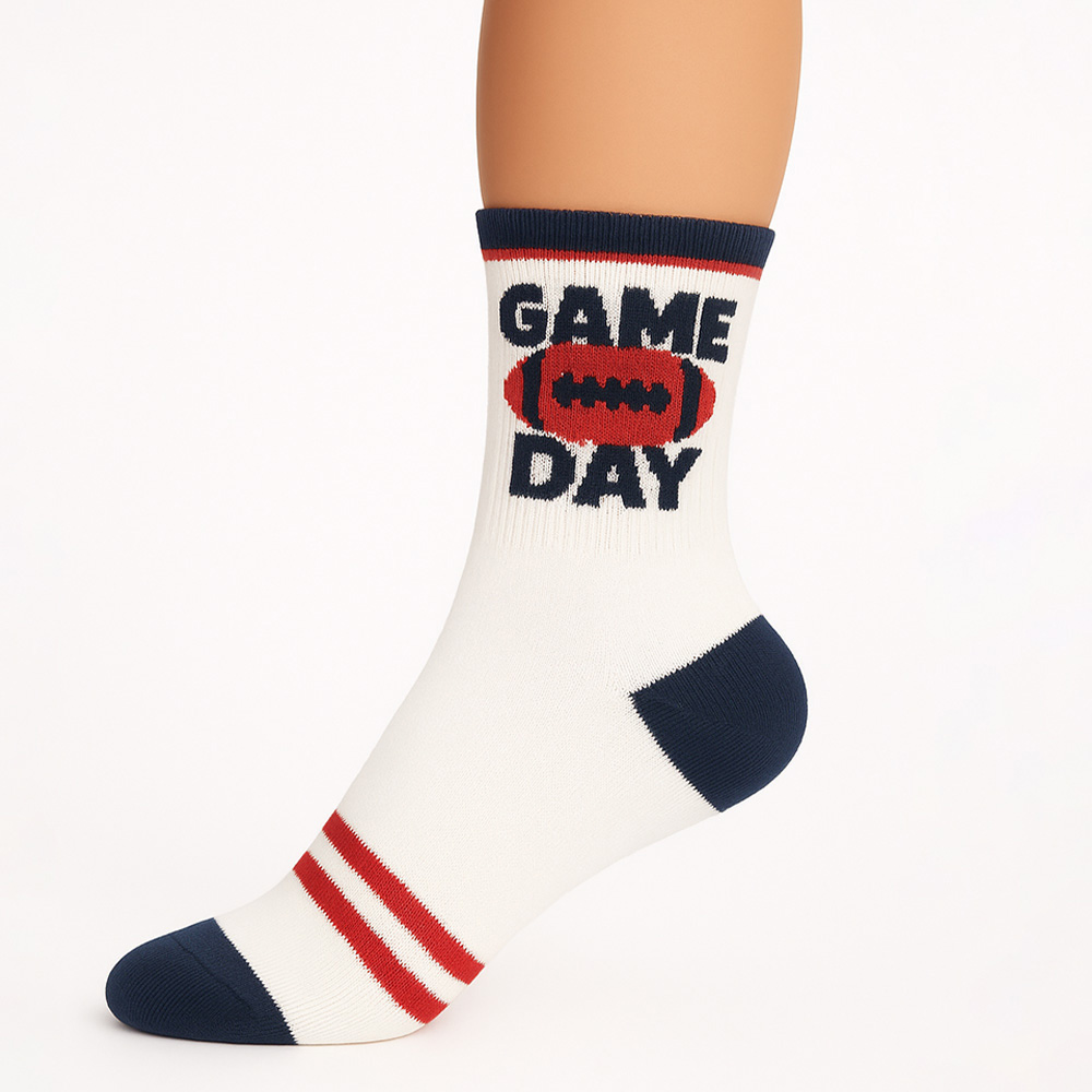 • Step up your team spirit with these gameday crew socks featuring a bold football and “Game Day” design. Perfect for tailgates, sports events, or casual wear, this 10-pack offers comfort and style, making them an essential accessory for every dedicated sports fan.