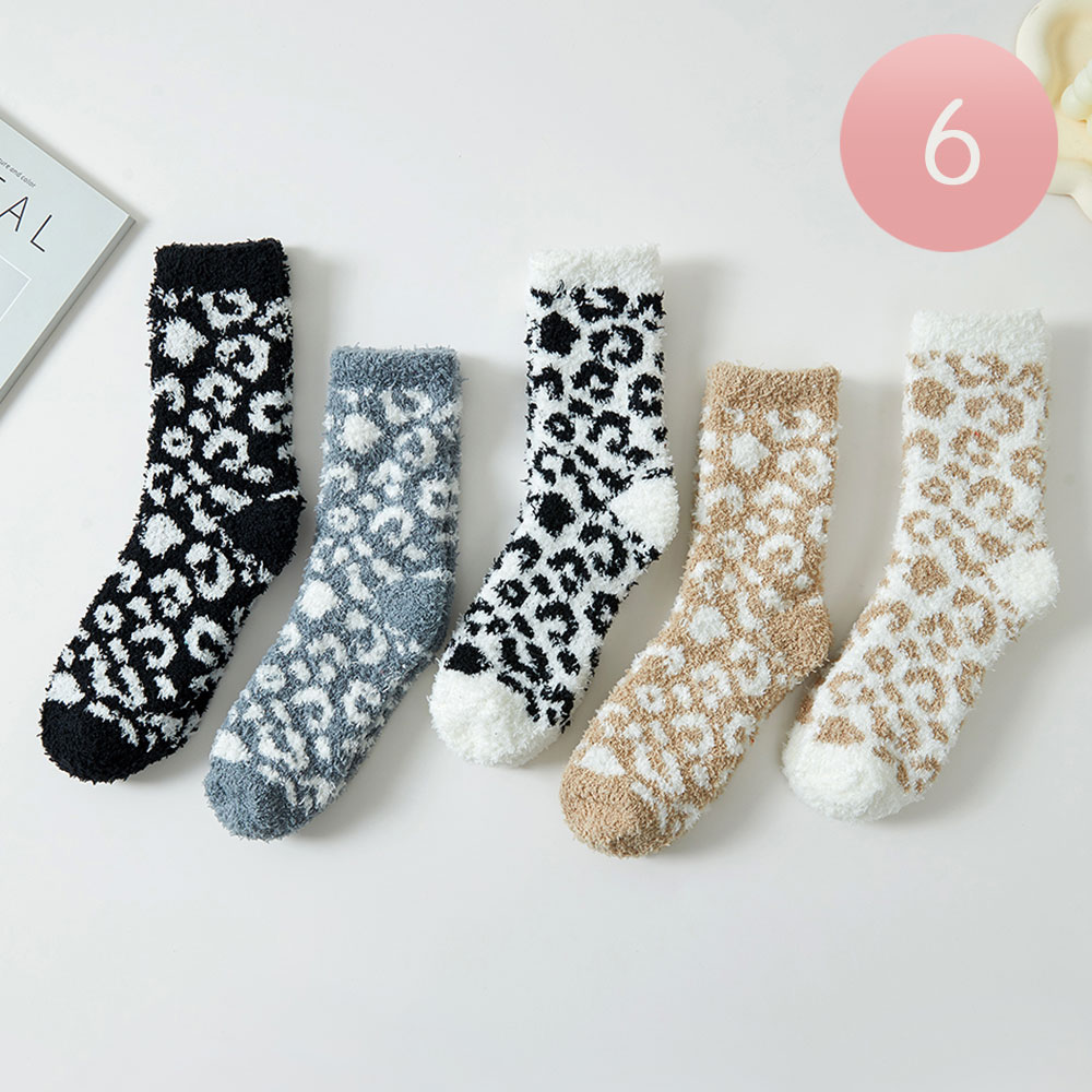 Details • Size : 9 - 11 • Material : 100% Polyester • Stay warm with this 6-pair set of fuzzy socks featuring bold leopard print designs. Ideal for winter lounging or daily indoor wear, these soft socks provide comfort, stretch, and cozy insulation all season long.