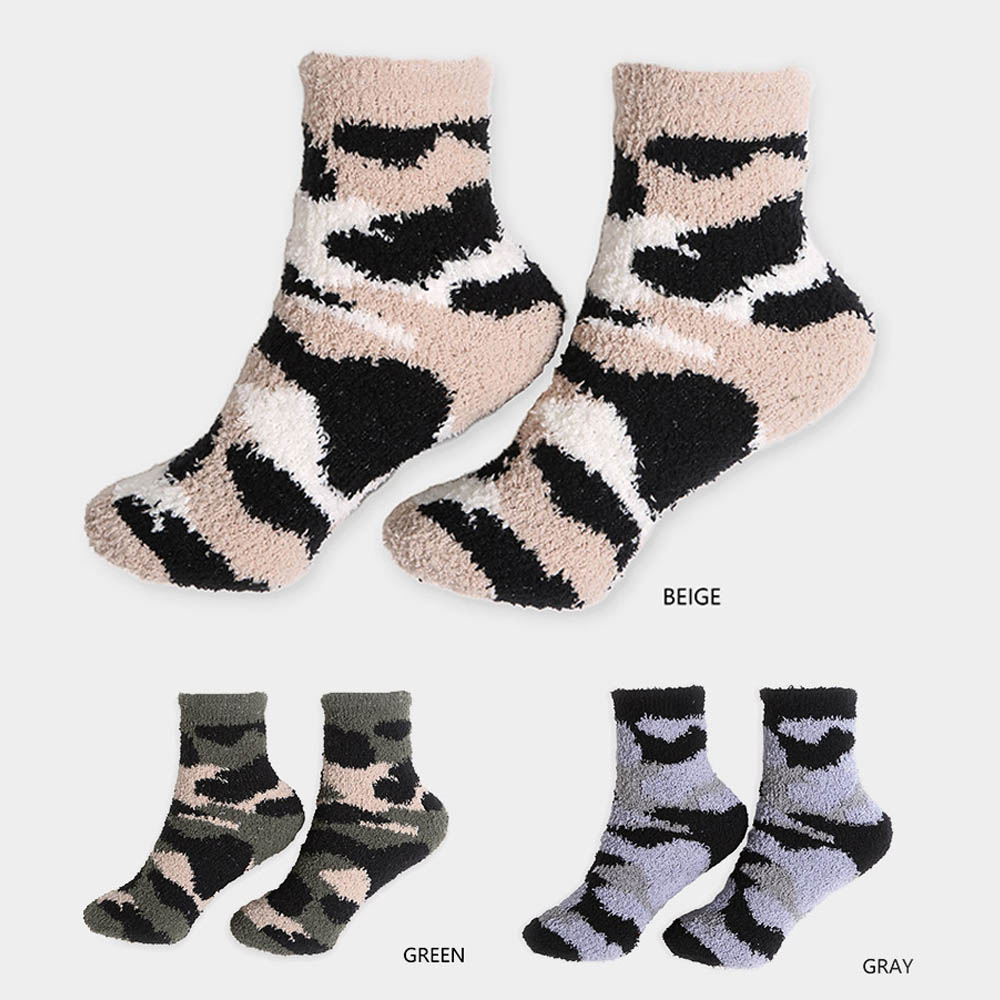 Details • Size : 9 - 11 • Material : 100% Poly.Microfiber • Warm and cozy fuzzy socks set with fun camouflage print designs. Perfect for lounging, relaxing, or gifting, these soft socks offer plush comfort and stretch for a snug fit. Ideal for keeping feet warm during colder days while adding a stylish touch to indoor wear.