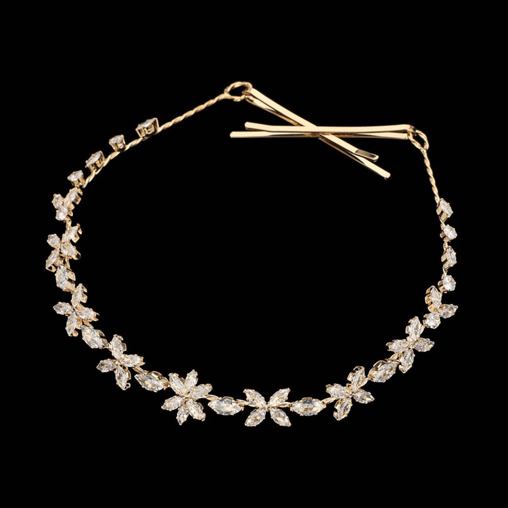 Details • Size : 15" X 0.4" • A Pair Bobby Pin and Sash Ribbon Included • Delicate floral hair vine designed to frame bun and updo hairstyles with sparkling crystal accents. Ideal for weddings, bridal looks, proms, and formal events. Lightweight and flexible for secure styling, adding an elegant and romantic finishing touch to special occasion hair. • CZ Cubic Zirconia