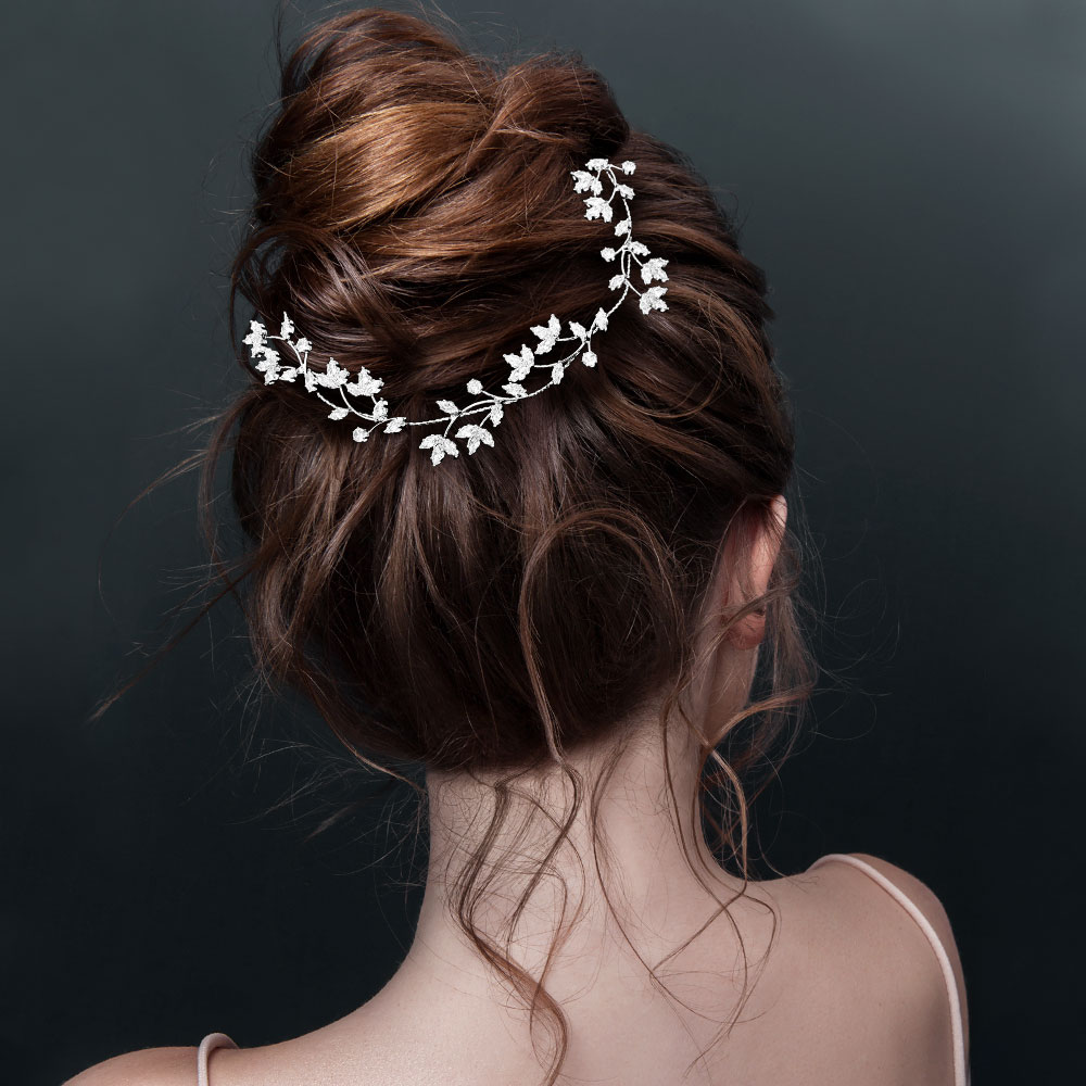 • This bridal hair vine showcases clusters of shimmering cz crystal leaves arranged along a flexible, nature-inspired design that curves elegantly around updos and half-up styles. Its refined sparkle and graceful detailing make it a perfect accessory for wedding and formal looks.