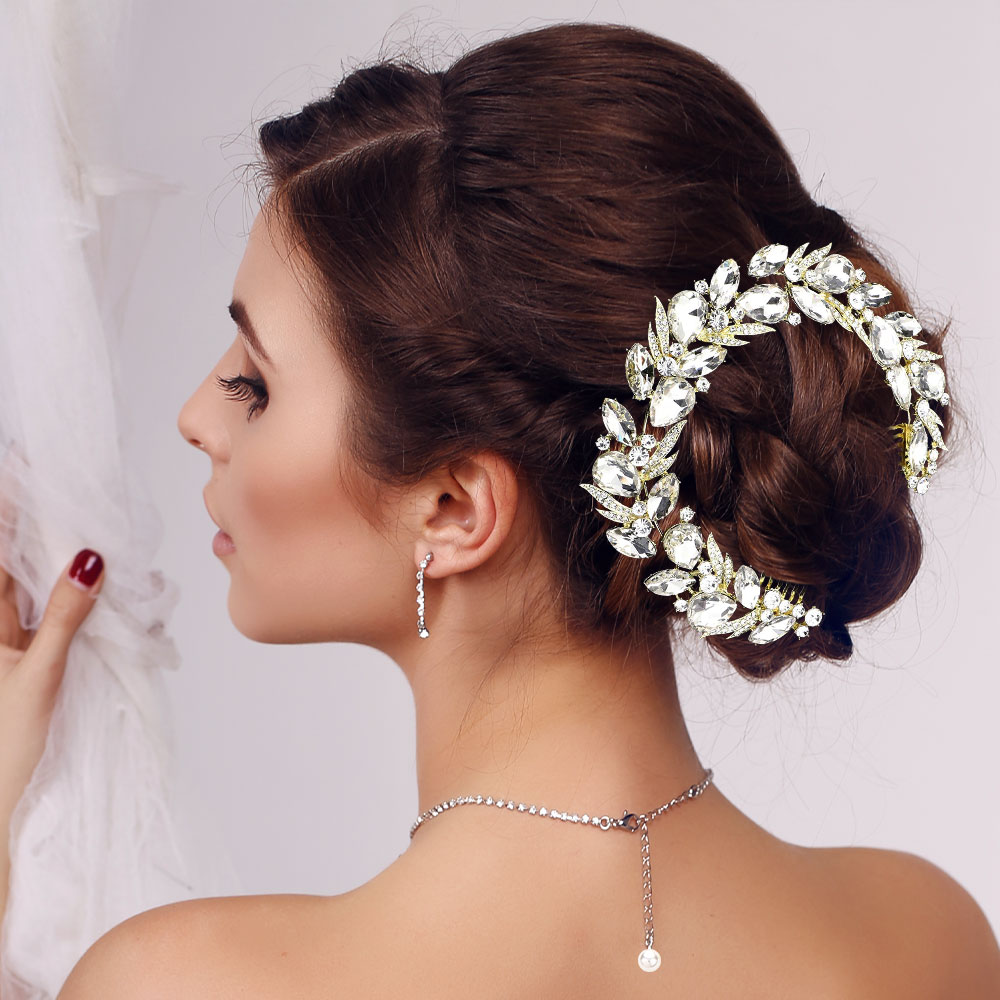 Details • Size : 11" X 1.25" • Complete your bridal look with this circular crystal hairpiece, designed with bold leaf and vine accents for a glamorous finish. Perfect for securing elegant updos, this sparkling accessory adds timeless charm to weddings, proms, and formal occasions.