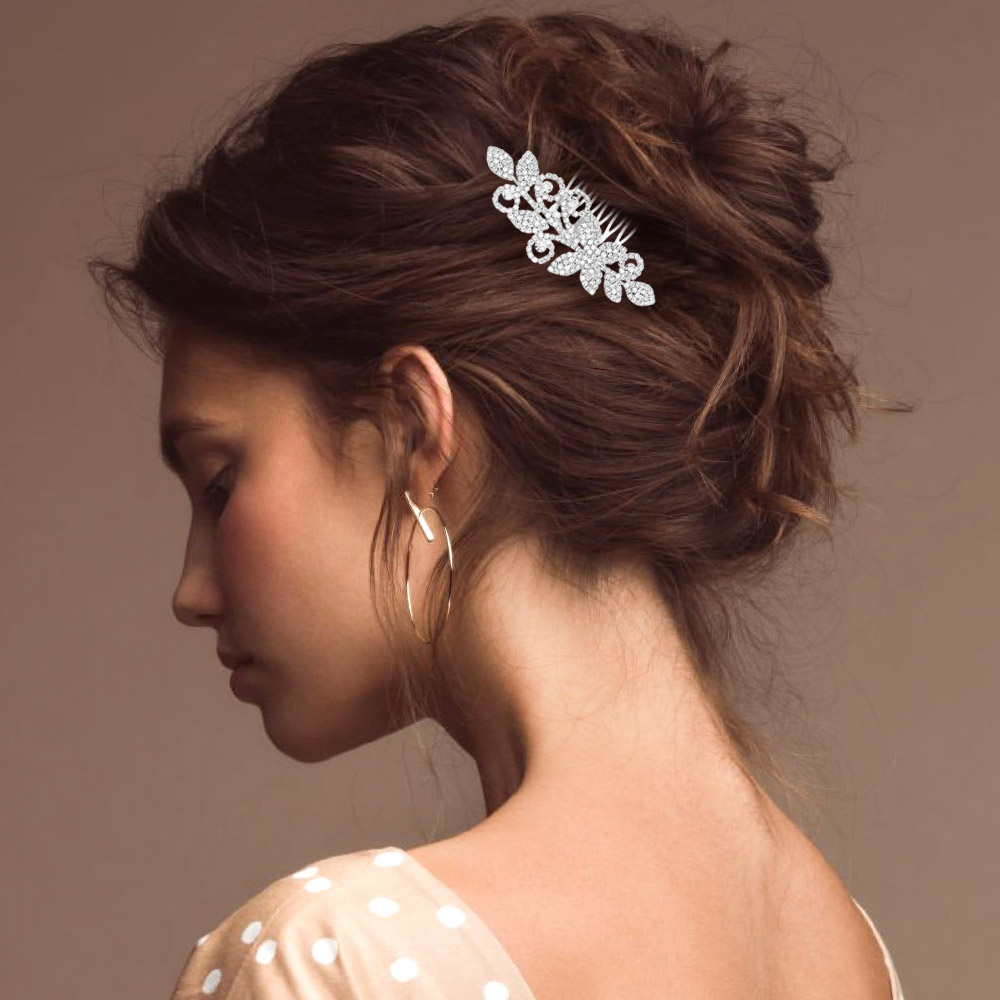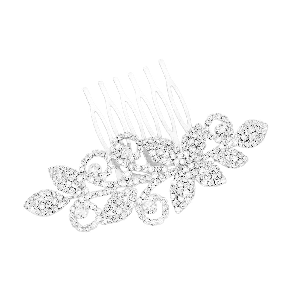 Details • Size : 3.5" X 1.25" • This elegant floral hair comb features intricate rhinestone detailing that adds a sparkling touch to any hairstyle. Ideal for weddings, proms, or special occasions, it offers a secure hold and timeless charm.