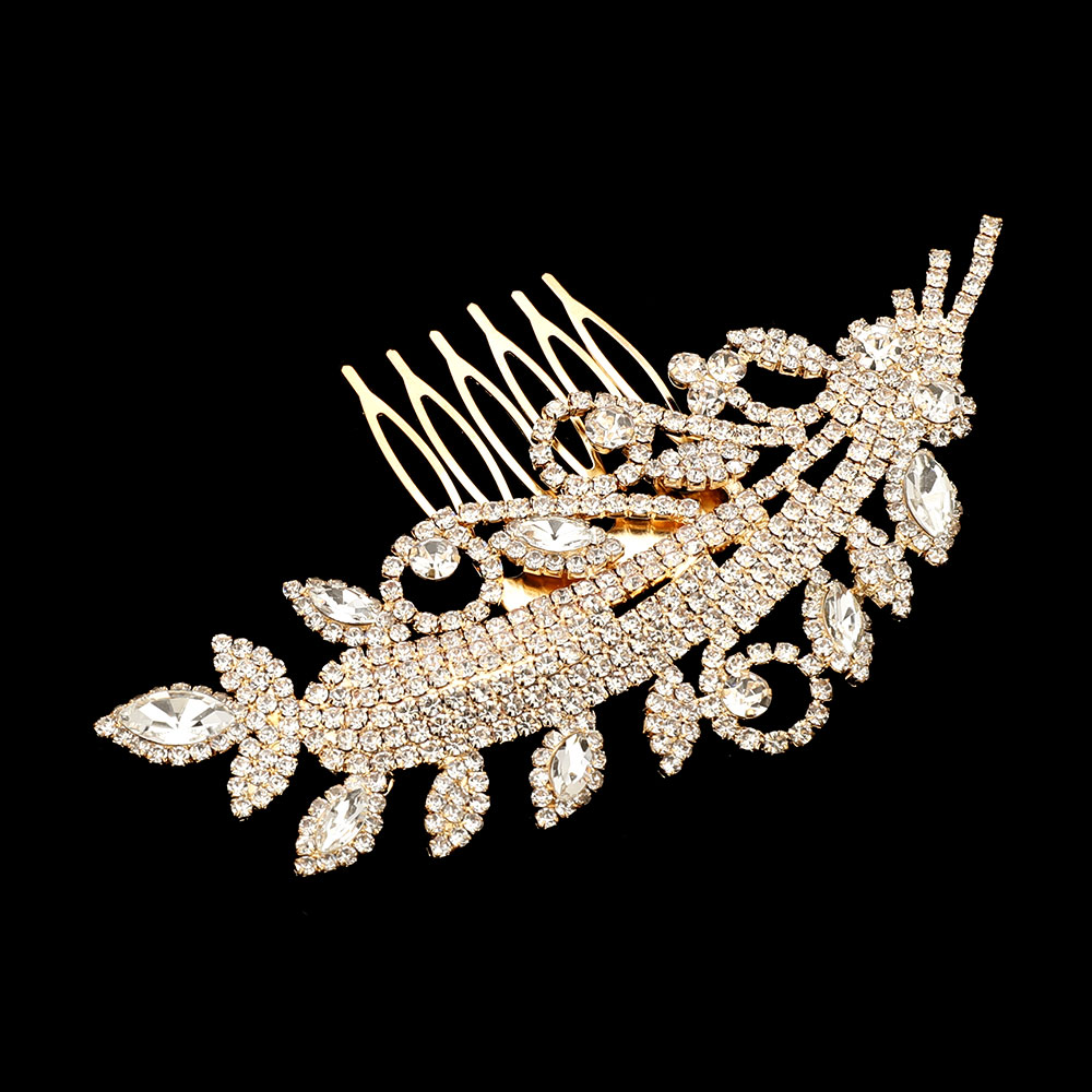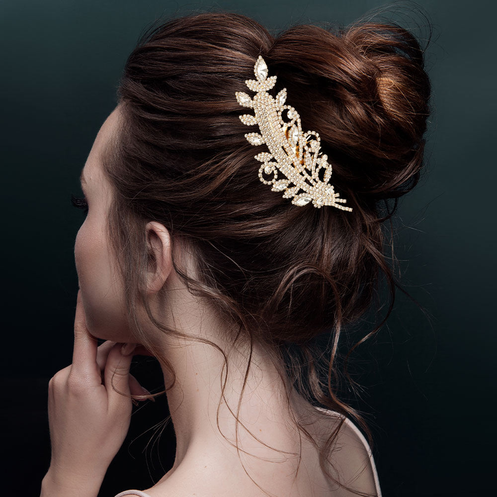 Details • Size : 4.5" X 1.9" • Illuminate your hairstyle with this rhinestone leaf hair comb featuring intricate curves and brilliant stone detailing. Its elegant, lightweight design adds refined sparkle, making it a perfect accessory for weddings, formal events, or elevating everyday looks with graceful shimmer.
