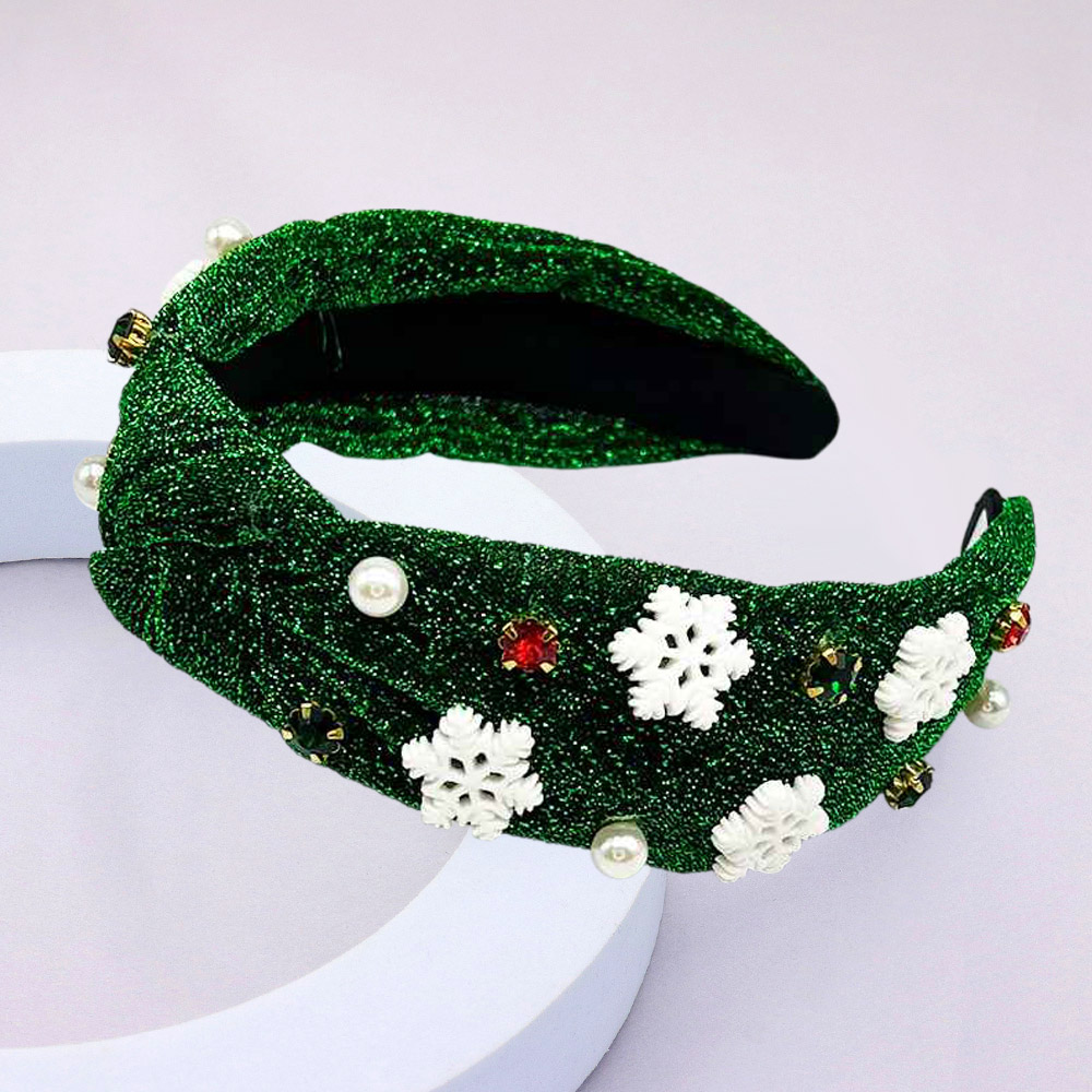 Details • Size : 2.5" H • Festive green headband adorned with snowflakes, pearls, and gems. Perfect for holiday parties, Christmas celebrations, and adding a cheerful seasonal touch to your winter outfits.