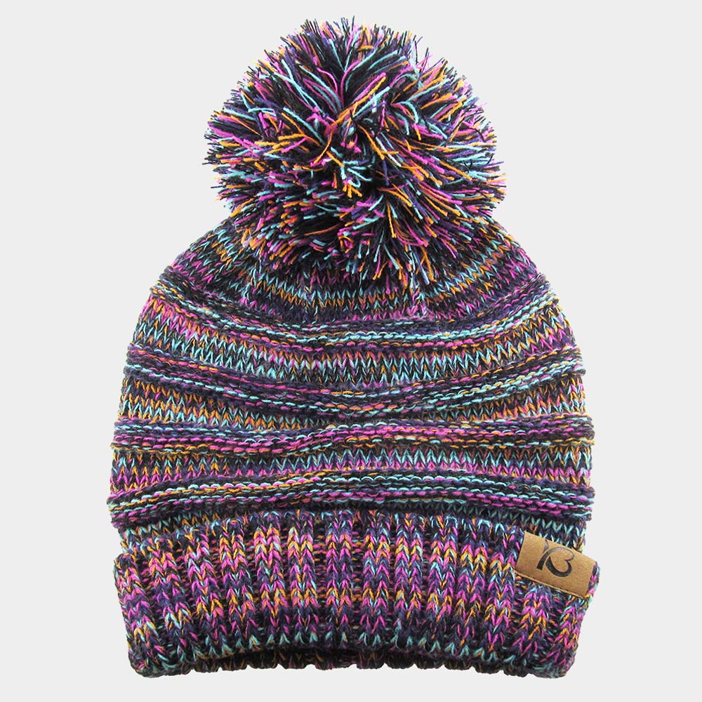 Fleece Lining Mixed Color Knit Faux Fur Pom Pom Beanie Hat