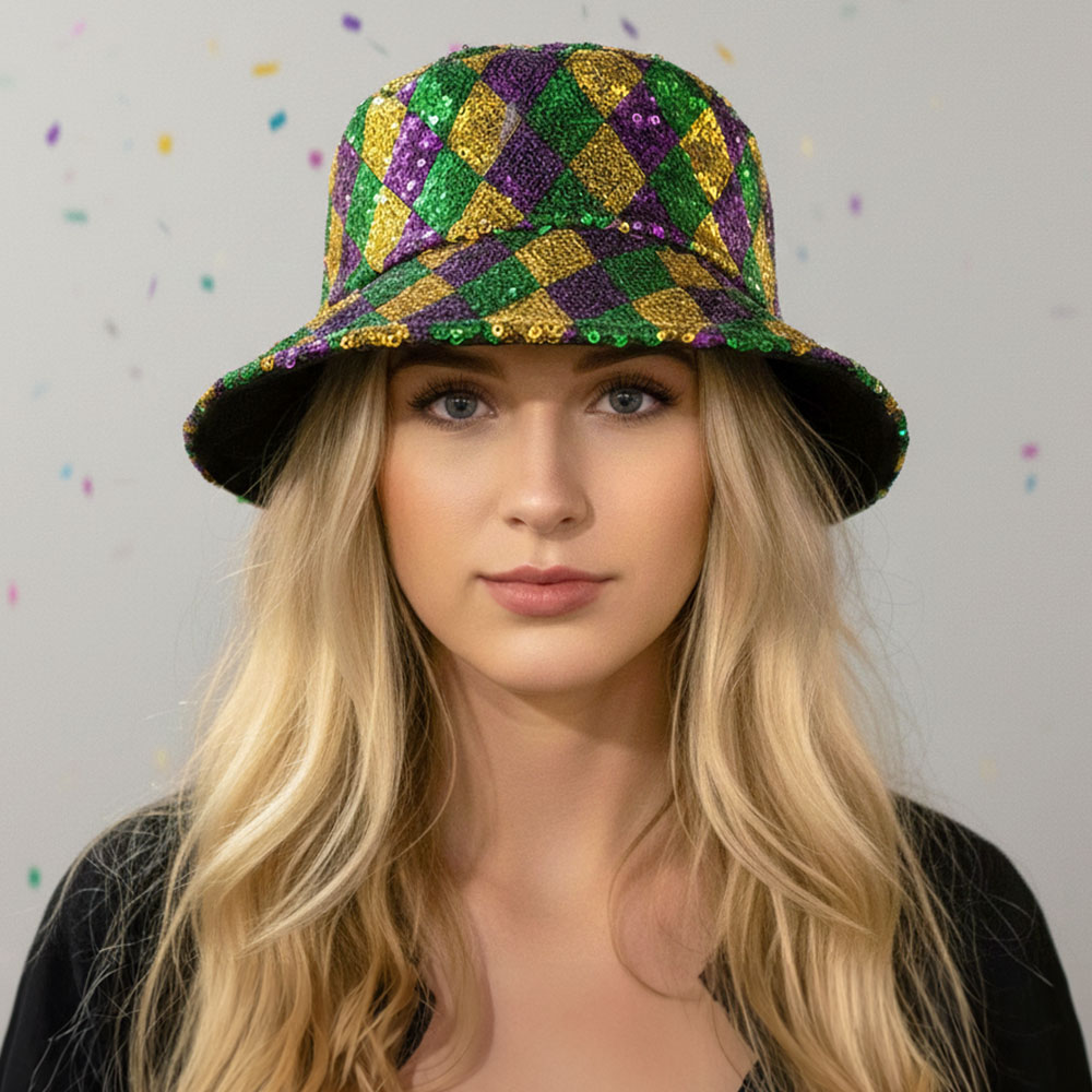 Details • Size : One Size • Add statement style with this sequin diamond pattern mardi gras bucket hat featuring a bold geometric design and classic bucket silhouette. Comfortable for all-day wear and easy to style, it’s ideal for festivals, concerts, themed events, or casual outfits that need a playful, standout finishing touch.