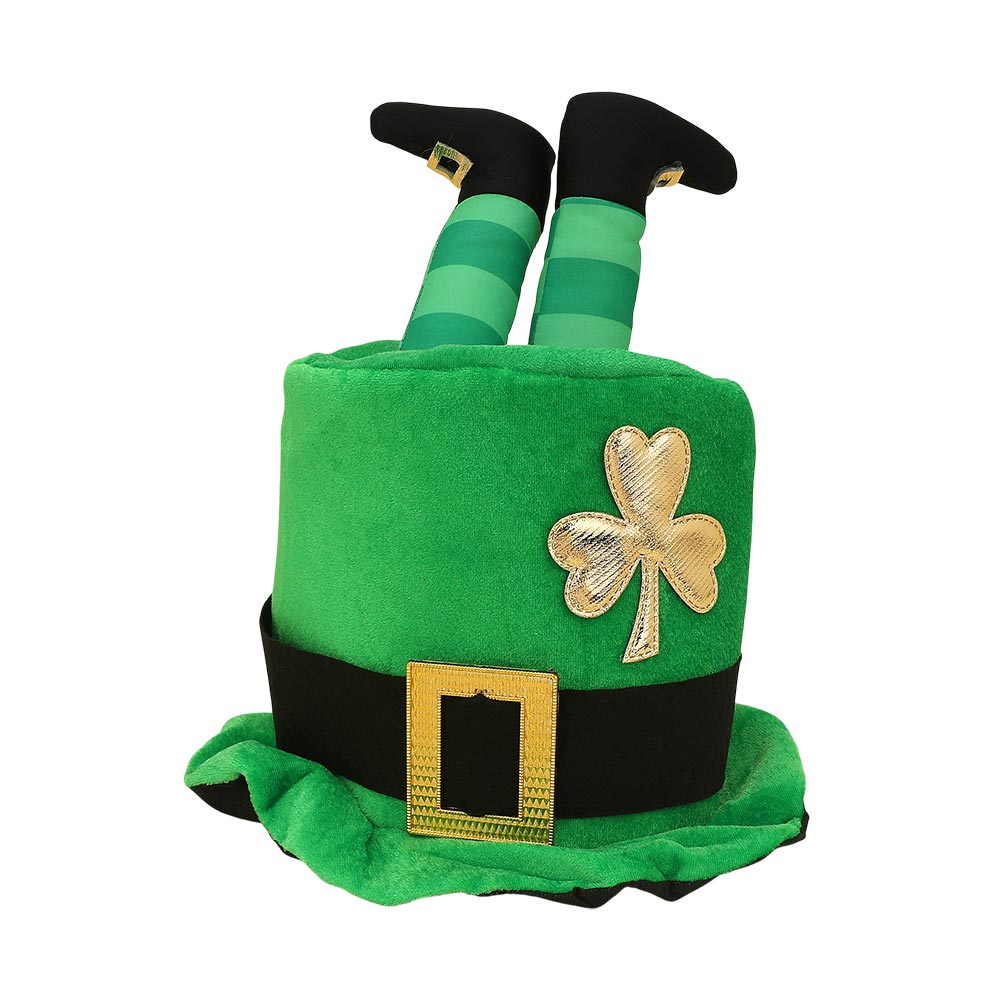 Details • Size : 15" H, 2.2" D • Fun leprechaun legs top hat featuring a whimsical upside-down design with shamrock detail for instant festive impact. A standout accessory for St. Patrick’s Day parties, parades, bar events, and themed celebrations, perfect for adding humor, personality, and crowd-grabbing charm to any holiday outfit.