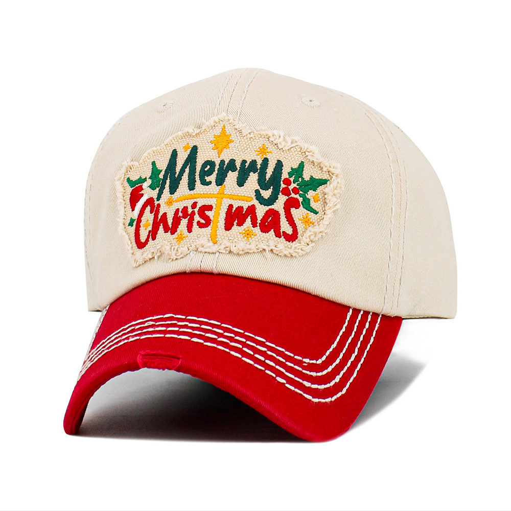 Details • Crown Circumference : 23" (Adjustable) • Crown Height : 4.5" • Brim Height : 3" • Material : 100% Cotton • Festive baseball cap featuring a bright “Merry Christmas” embroidered patch with a distressed edge for a cheerful holiday look. Ideal for casual wear or seasonal gatherings, this adjustable cap adds a fun and spirited touch to your winter wardrobe and festive celebrations.
