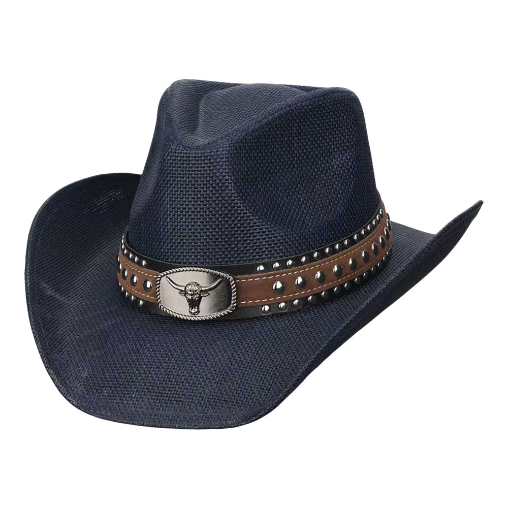 Details • Crown Circumference: 23" • Crown Height : 5.5" • Brim Width : 3.5" • Material : 100% Straw • Bold western-inspired cowboy hat featuring a structured silhouette and a stud-accented band with oval steer head buckle detail. Designed to elevate festival looks, themed collections, and statement outfits, this hat adds rugged character and standout style to any accessory assortment.