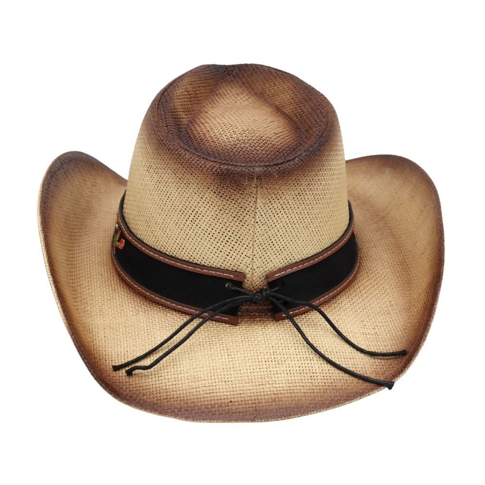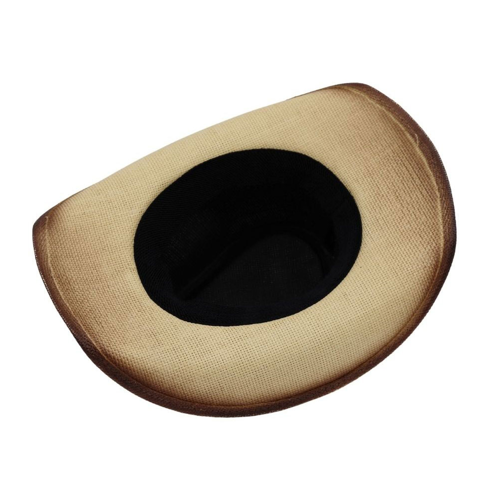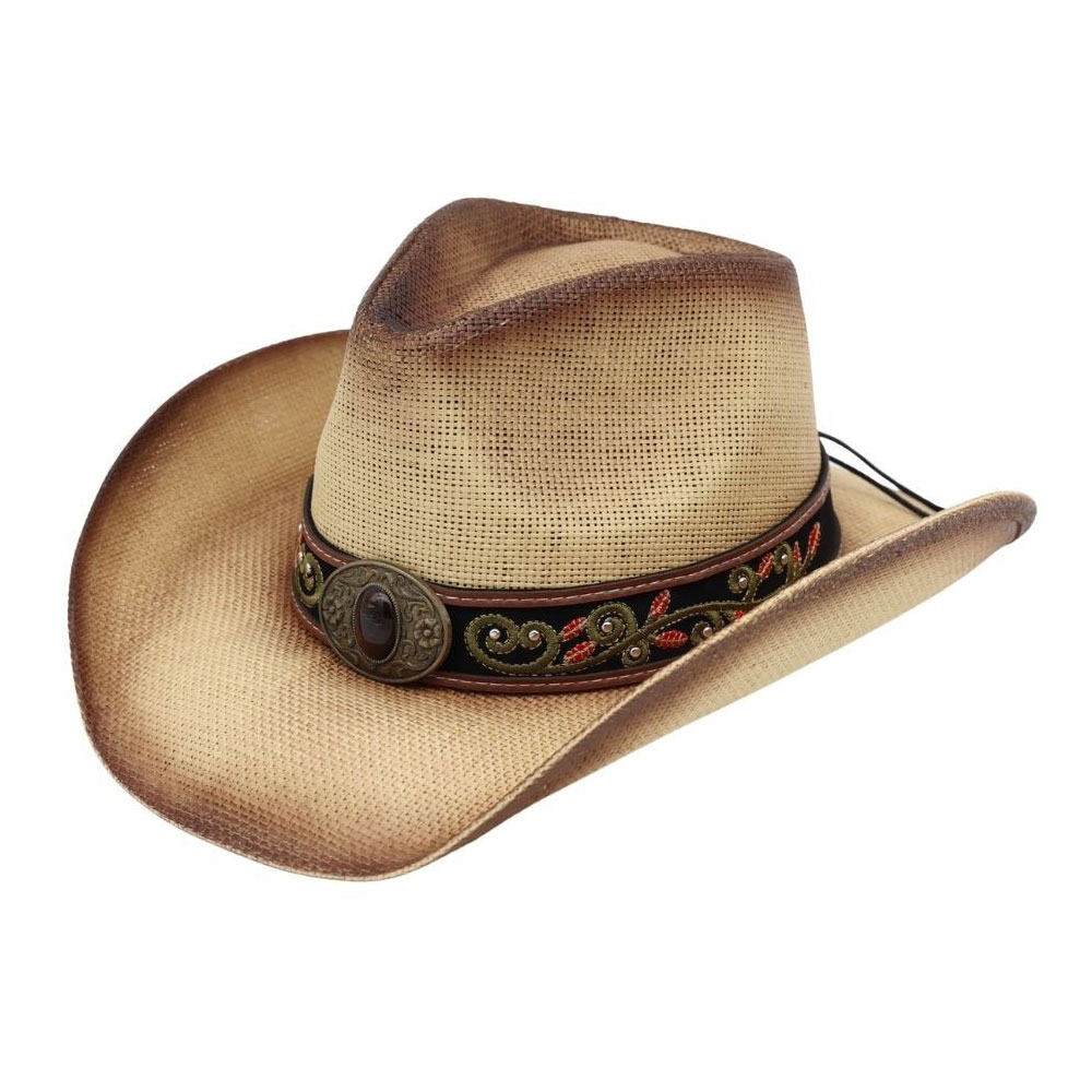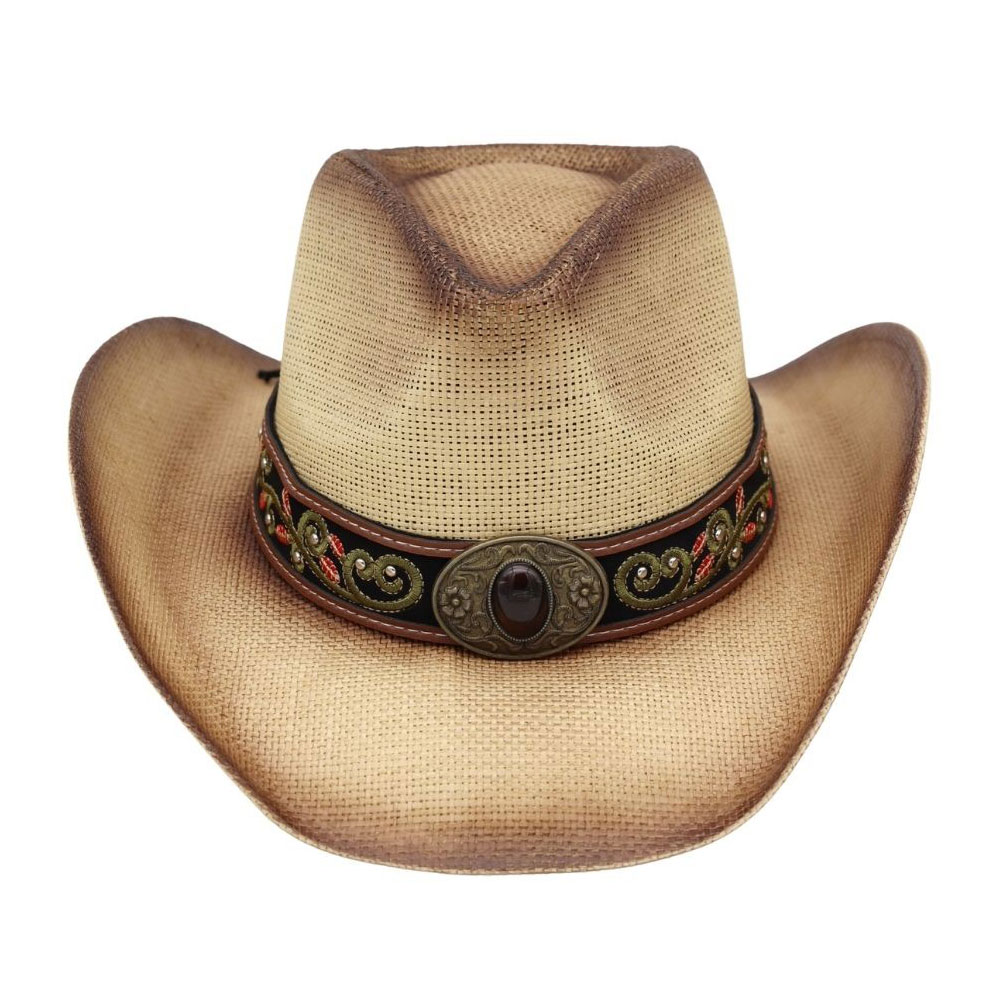 Boho Oval Stone Accent Ornate Faux Leather Band Distressed Straw Western Cowboy Hat