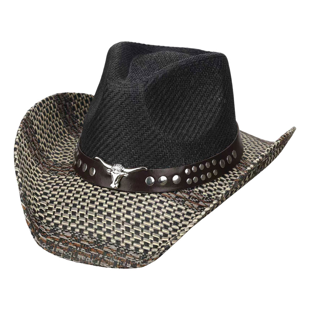 Boho Steer Head Accent Studded Faux Leather Band Woven Straw Western Cowboy Hat
