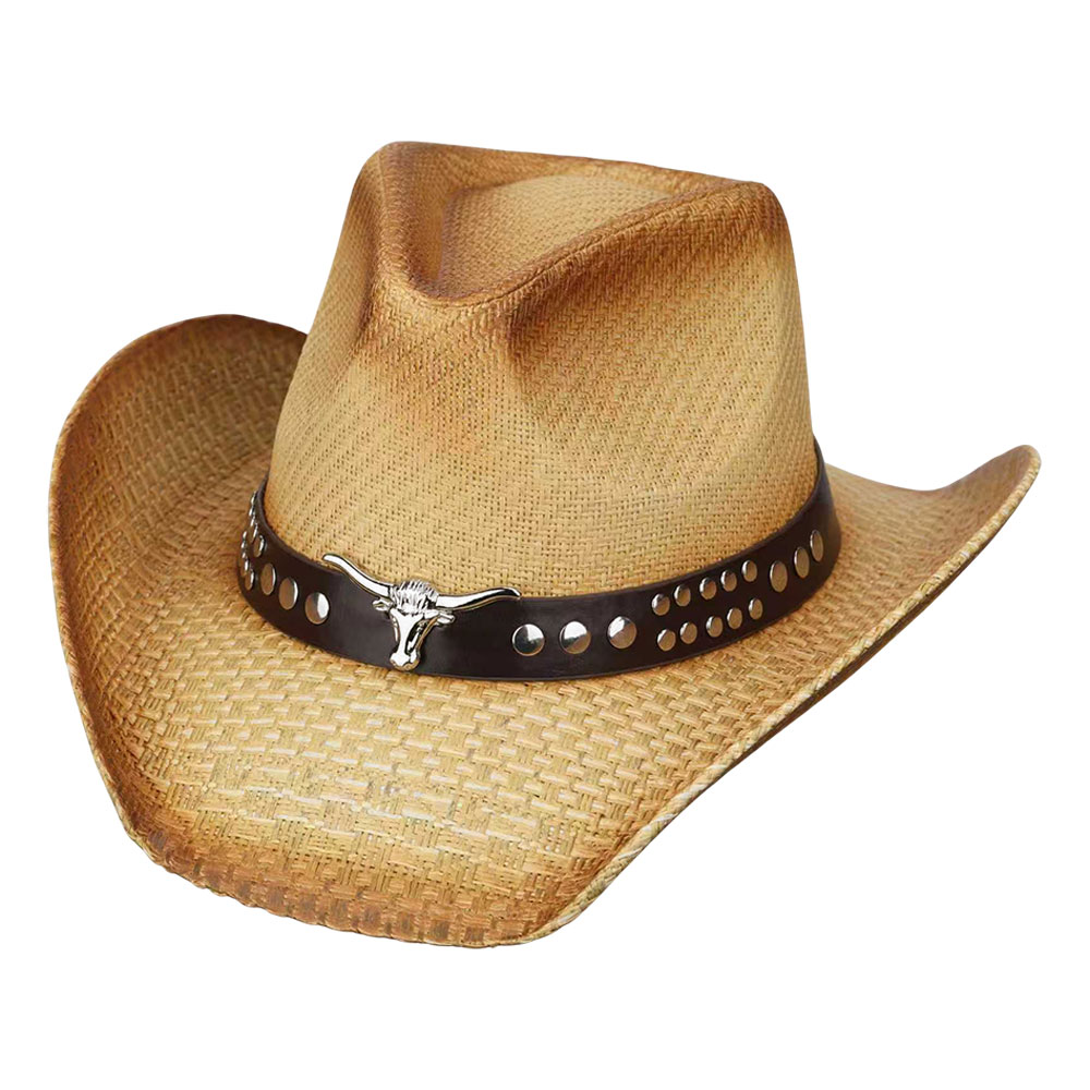 Boho Steer Head Accent Studded Faux Leather Band Woven Straw Western Cowboy Hat
