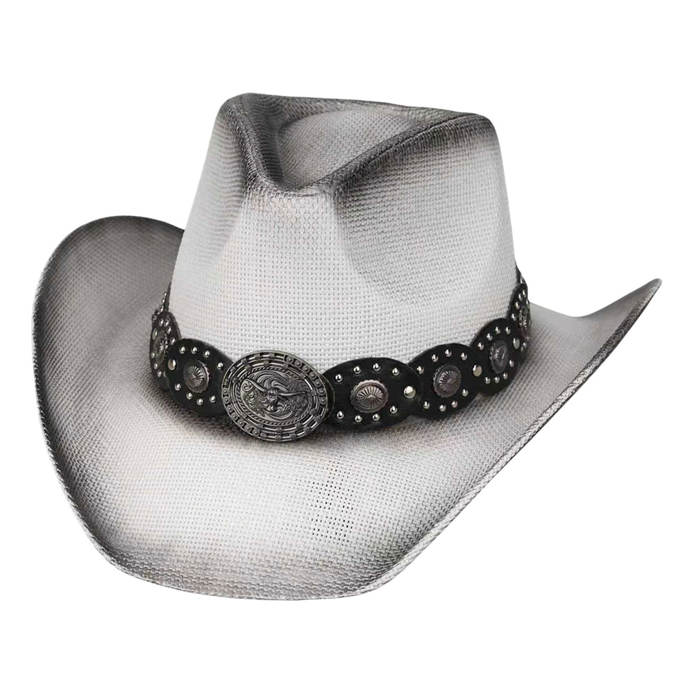 Details • Crown Circumference: 23" • Crown Height : 5.5" • Brim Width : 3.5" • Material : 100% Straw • Bold western cowboy hat featuring a structured crown, curved brim, and an ornate medallion band with decorative stud detailing. Designed for western fashion collections, rodeo styling, festivals, and themed outfits, this statement hat adds authentic western character and standout appeal.