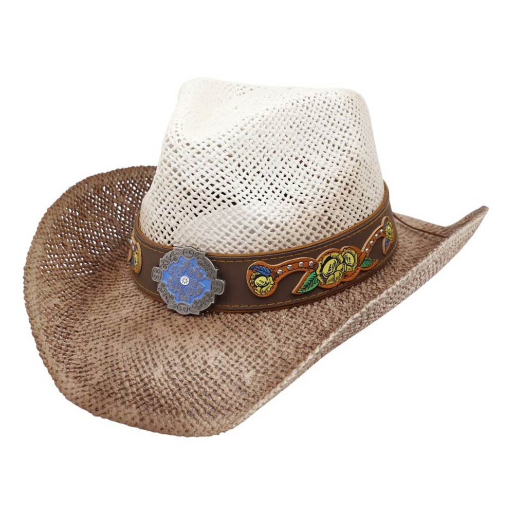 Boho Two Tone Rhinestone Studded Floral Concho Band Western Straw Cowboy Hat