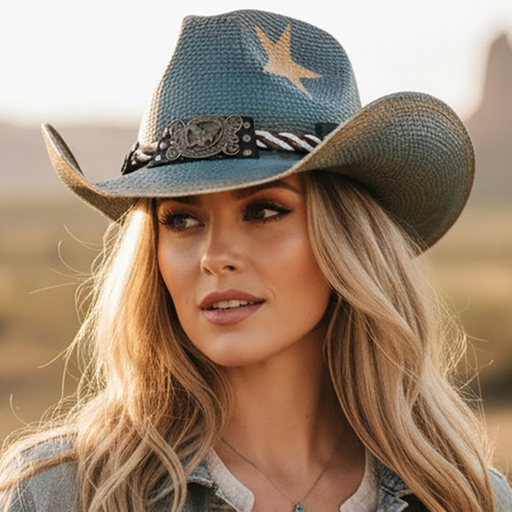 • This western cowboy hat features a structured crown, curved brim, and bold star accent for a statement western look. Ideal for festivals, country outfits, rodeo events, stage wear, and boutique displays seeking eye-catching western style with standout character.