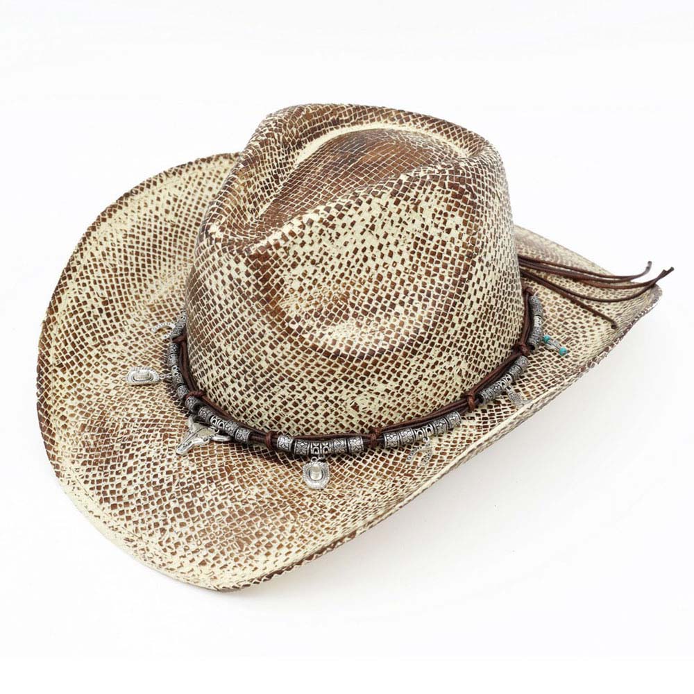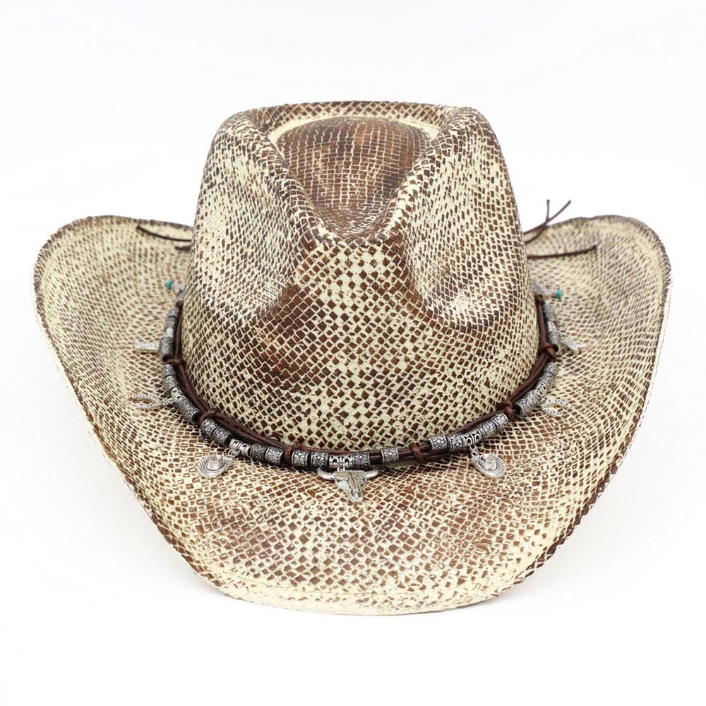 Handmade Vintage Steer Head Cactus Horseshoe Charm Faux Leather Band Western Straw Cowboy Hat