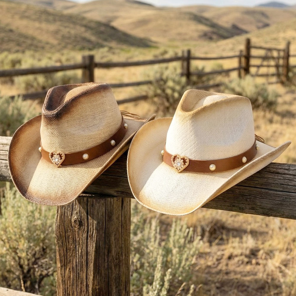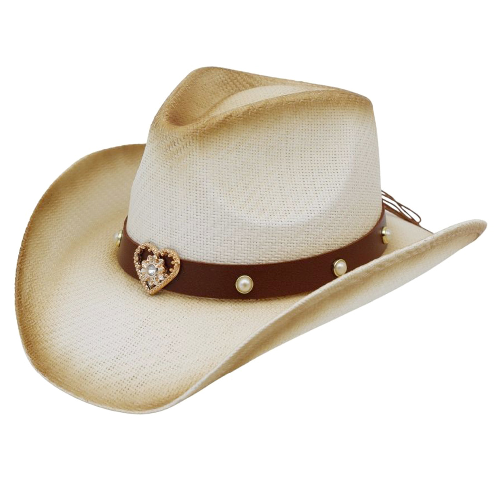 Heart Charm Accent Pearl Studded Faux Leather Band Aged Look Two Tone Western Woven Cowboy Hat