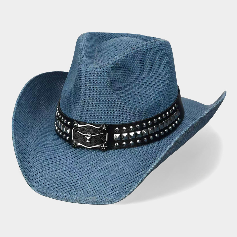 • Statement western cowboy hat featuring a structured crown, curved brim, and a bold studded buckle band with western-inspired detailing. Ideal for rodeo looks, western fashion collections, festivals, stage styling, and themed outfits, offering strong character and eye-catching western appeal.