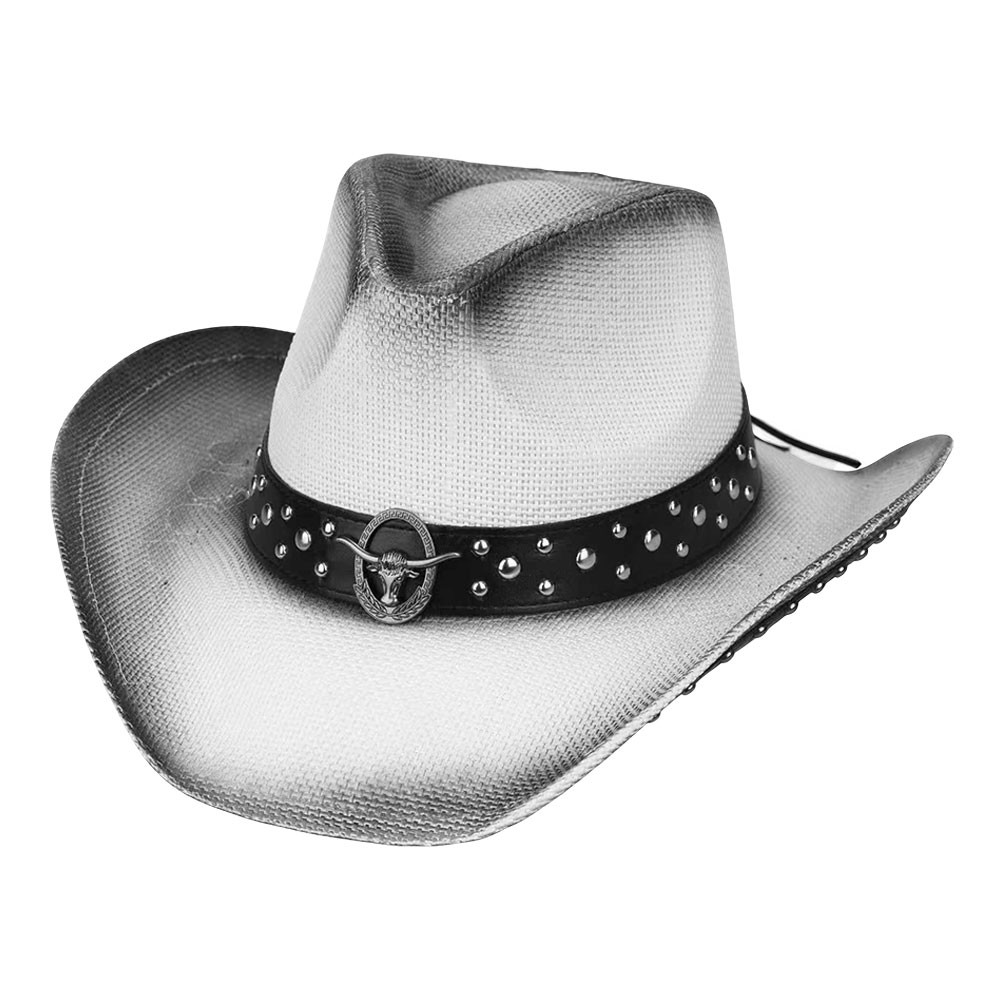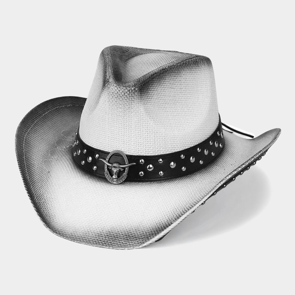 Metal Steer Head Emblem Studded Faux Leather Band Western Straw Cowboy Fedora Hat