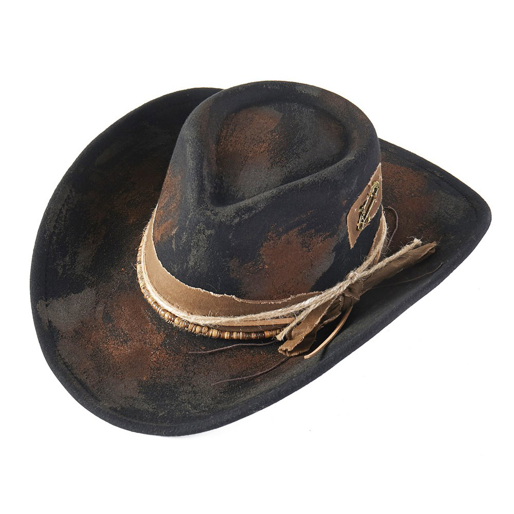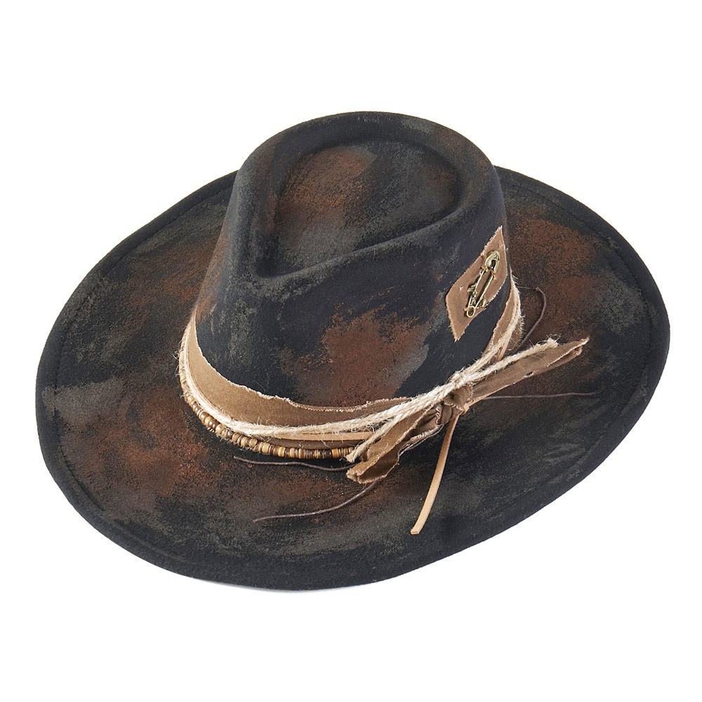 • Make a statement with the Distressed Western Hat, featuring a rugged design and rustic band detail. Its weathered finish and handcrafted accents create an authentic vintage feel, perfect for outdoor adventures, festivals, or casual wear with timeless western-inspired charm.