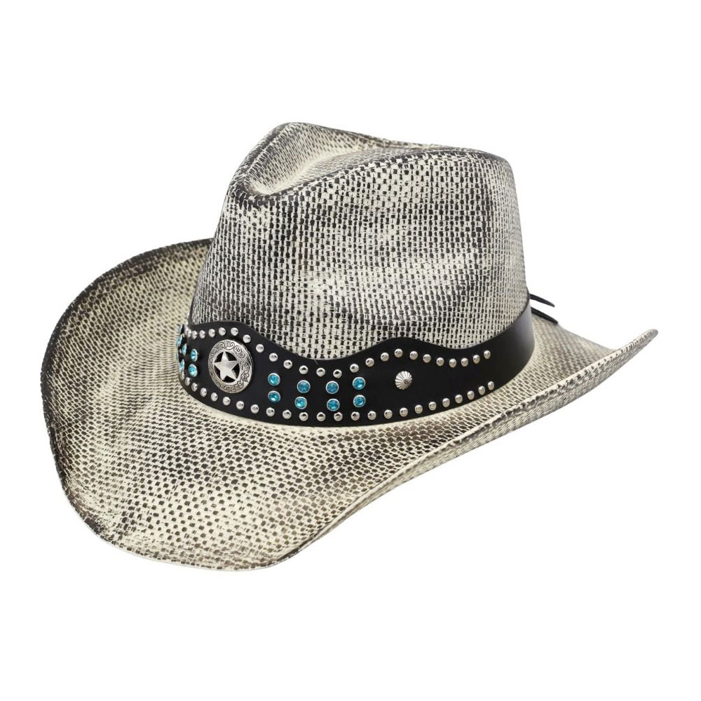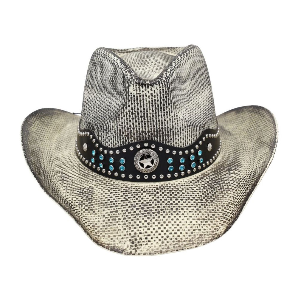 Details • Size : One Size • Material : 100% Paper • Eye-catching western cowboy hat designed with a structured crown, curved brim, and bold studded band featuring a star concho accent. Ideal for western fashion styling, rodeo looks, themed events, and boutique displays, offering a statement silhouette with classic cowboy character.